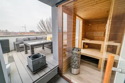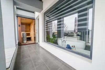 - Elkülönített, 45 m²-es TETŐTERASZ JAKUZZIVAL, SZAUNÁVAL és VÁROSI PANORÁMÁVAL – HÁBORÍTATLAN KIKAPCSOLÓDÁS.