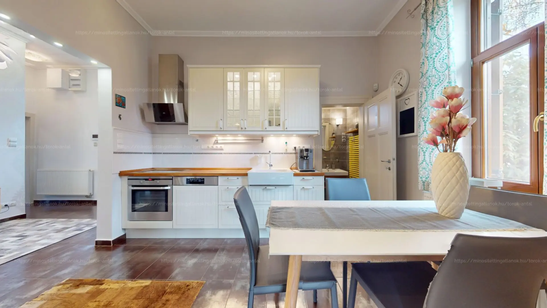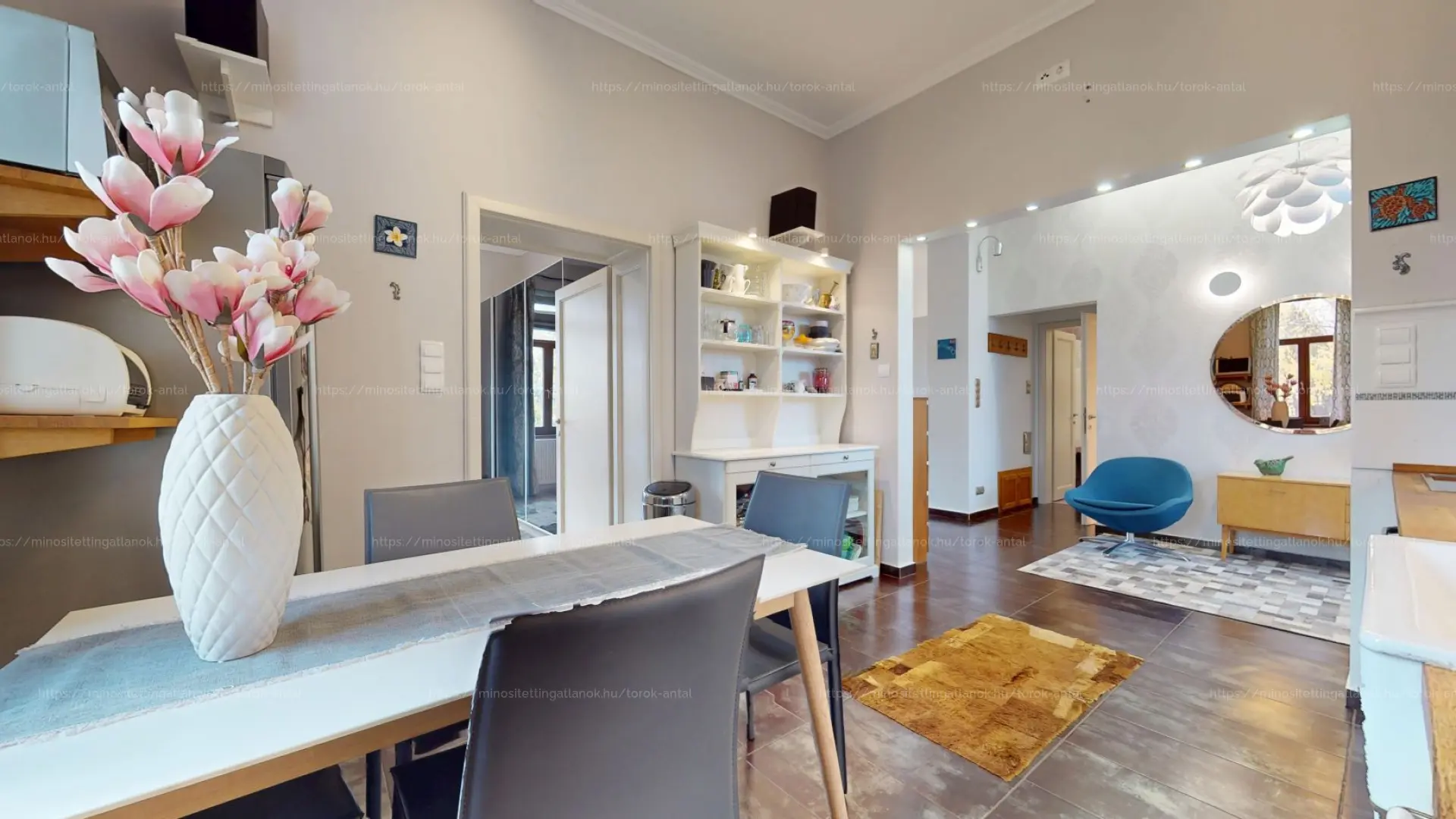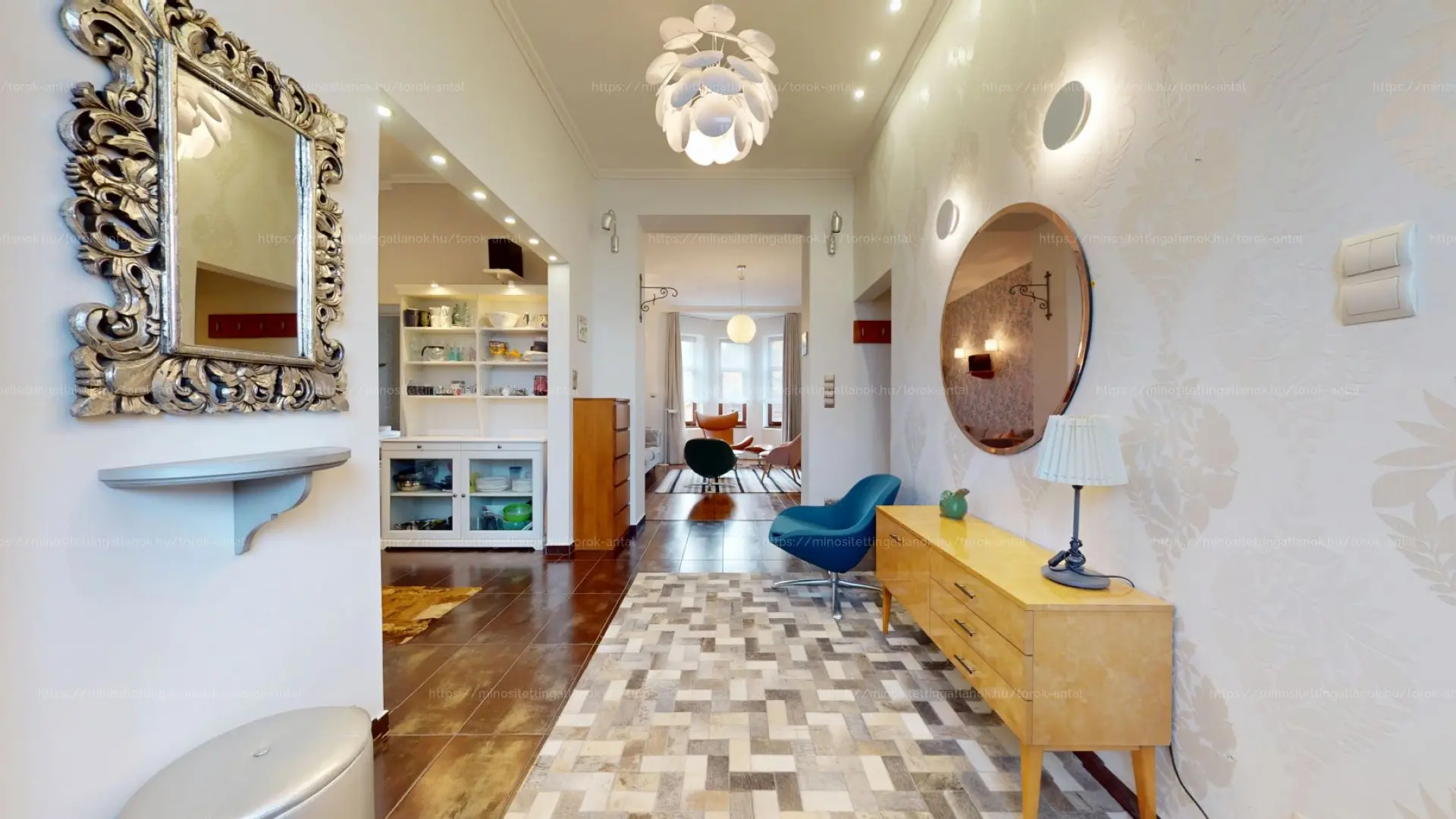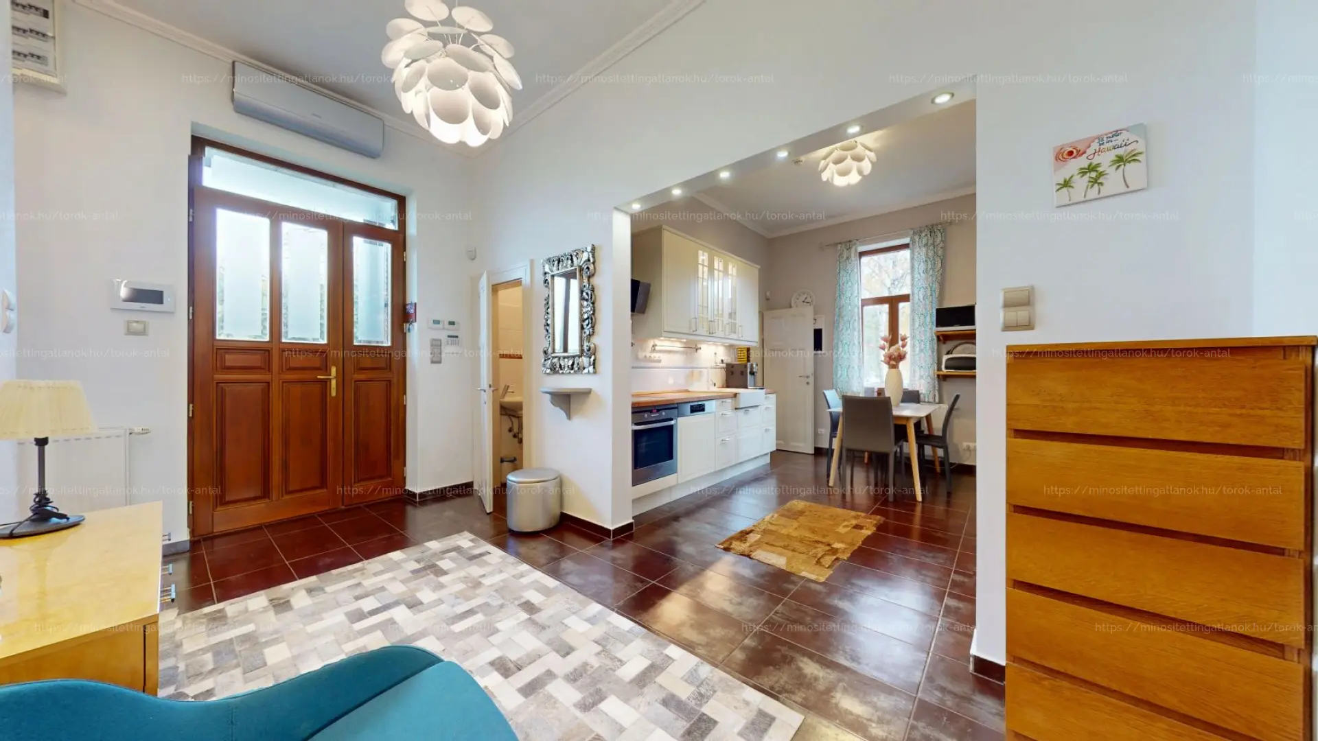 A tágas előszobából balra nyílik az épített bútorral felszerelt konyha, jobbra pedig egy szoba, mely jelenleg vendégszobaként funkcionál, melyből közvetlen kijárat nyílik
