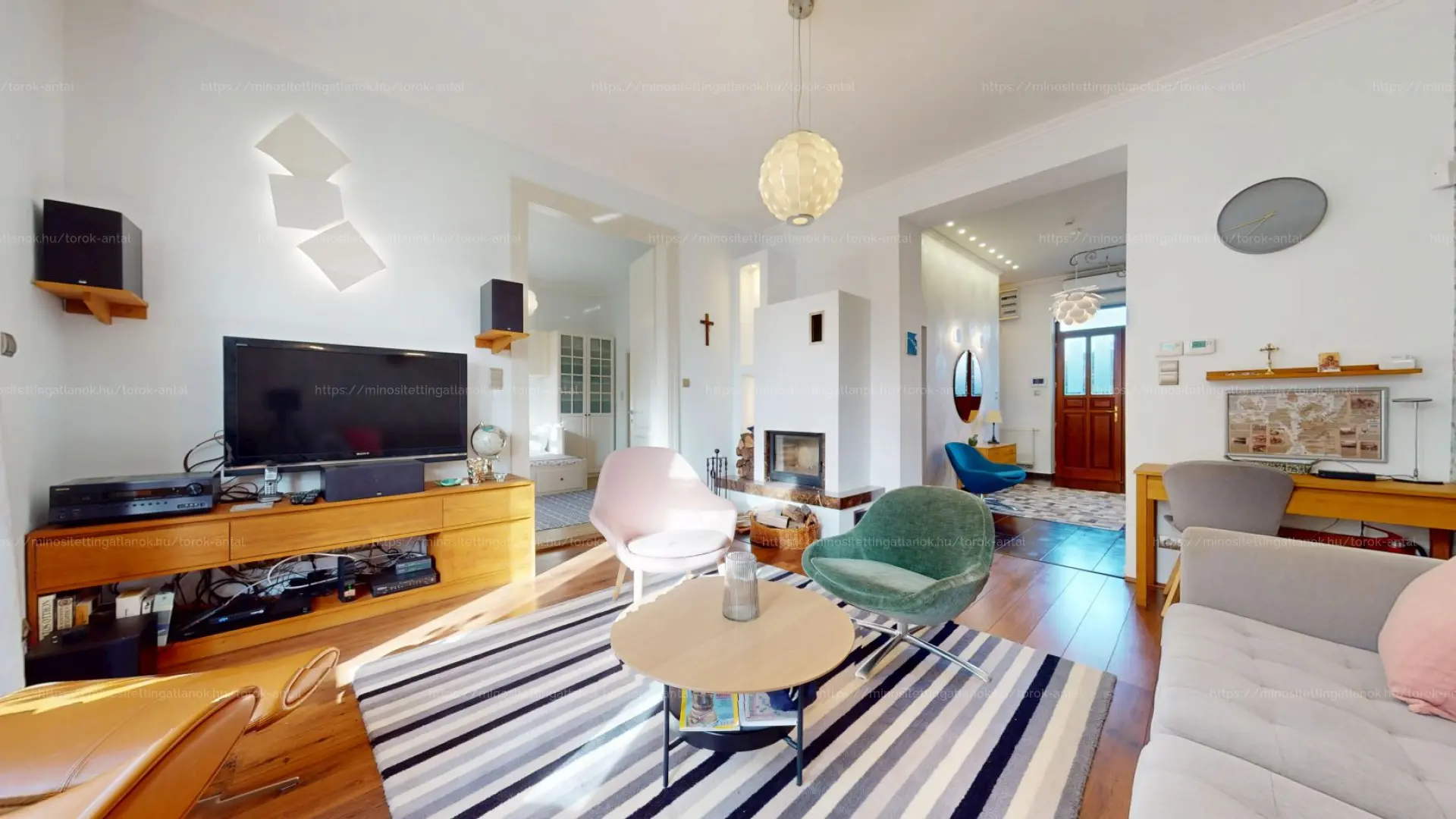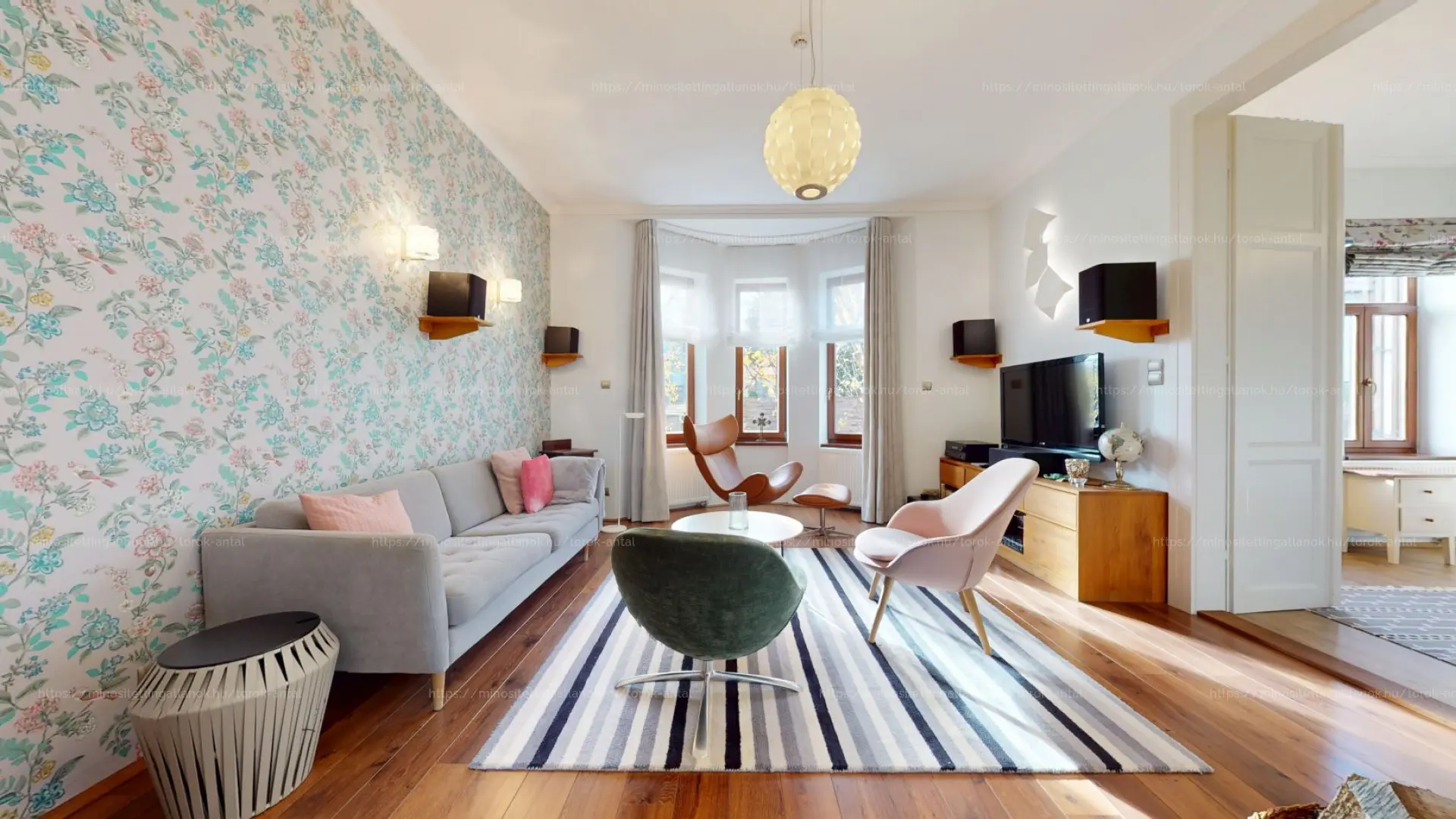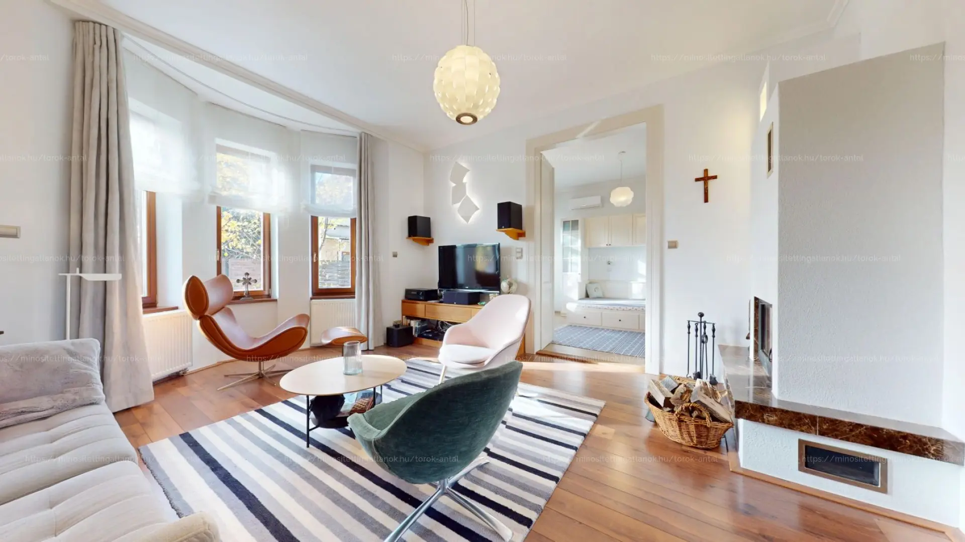A bejárati ajtóval szemben található az igényesen megtervezett, tágas nappali, mely nagy ablakainak köszönhetően rendkívül világos és napfényes.