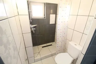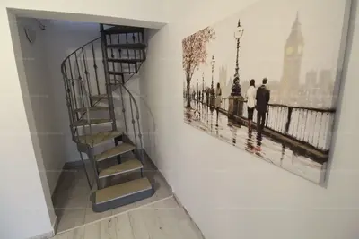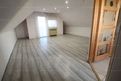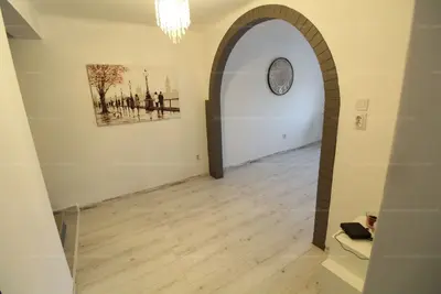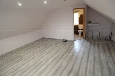 Az alsó szinten található az étkezős konyha, de rendelkezésre áll a korábban kialakított konyha is. Nappali, WC-zuhanyzó és az emeleti feljáró van még itt. A felső szinten tágas szoba, abból nyíló fedett erkély és kádas fürdőszoba lett kialakítva. Az alagsorban egy korábban lakott kis lakrész, valamint egy mosókonyha is rendelkezésre áll.