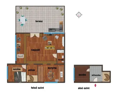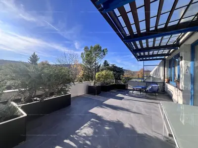 A nappali + két hálószobás elrendezéshez egy impozáns, 40 m²-es, D-i tájolású terasz is tartozik ideális hely a nyugalom és a kilátás élvezetére.
