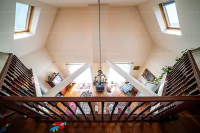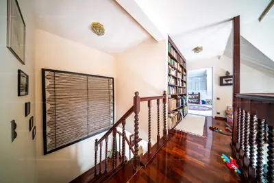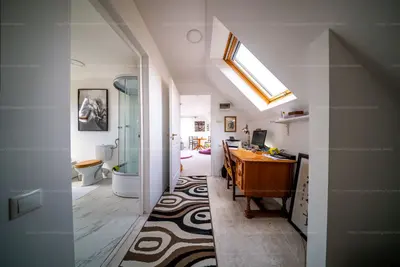 Az emeletre egy masszív fa lépcsőn juthatunk fel, ahol további 3 hálószobát, 2 gardróbot/közlekedőt, és egy hatalmas fürdőszobát találunk.