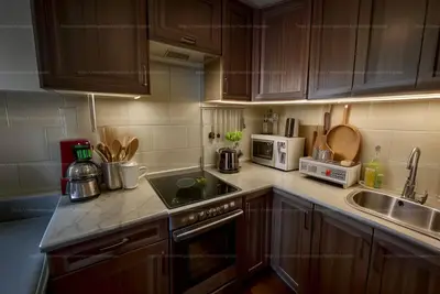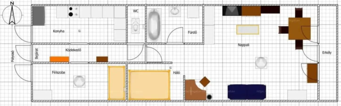 Beosztása: nappali + 2 hálófülke, konyha, fürdőszoba, külön WC, valamint közös tároló is tartozik hozzá.