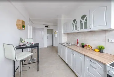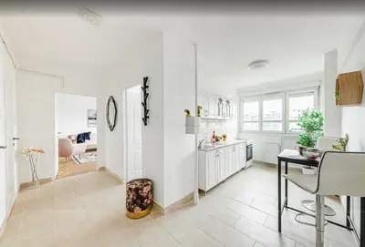 A lakásba belépve egy tágas, világos konyha képe tárul elénk. Ez meg is alapozza bennünk az érzést, hogy világos, szellős, kényelmes nagy terek alkotják a lakást.