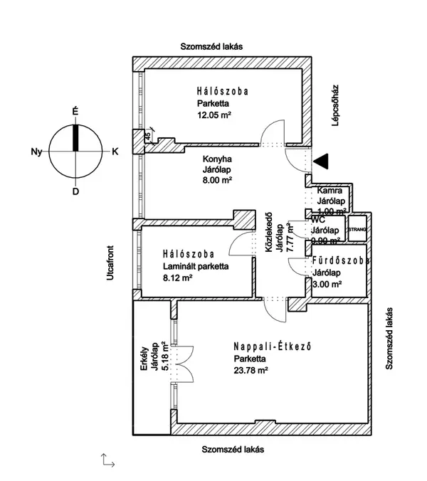 A lakásnak 3 szobája, egy kádas fürdőszobája, külön toalettje és egy 4 m2-es erkélye van. Valamint a pincében tartozik hozzá egy 4 m2-es önálló tároló is.
