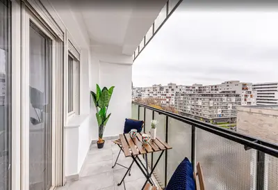 A lakás nem a Mester utcára, hanem a Duna irányába néz. „Városi panorámás”, vagyis rá lehet látni a Duna parti Nemzeti Színházra, illetve a MÜPA-ra, a MOL toronyra, de látszik innen a Gellért hegy is a Szabadság szoborral.