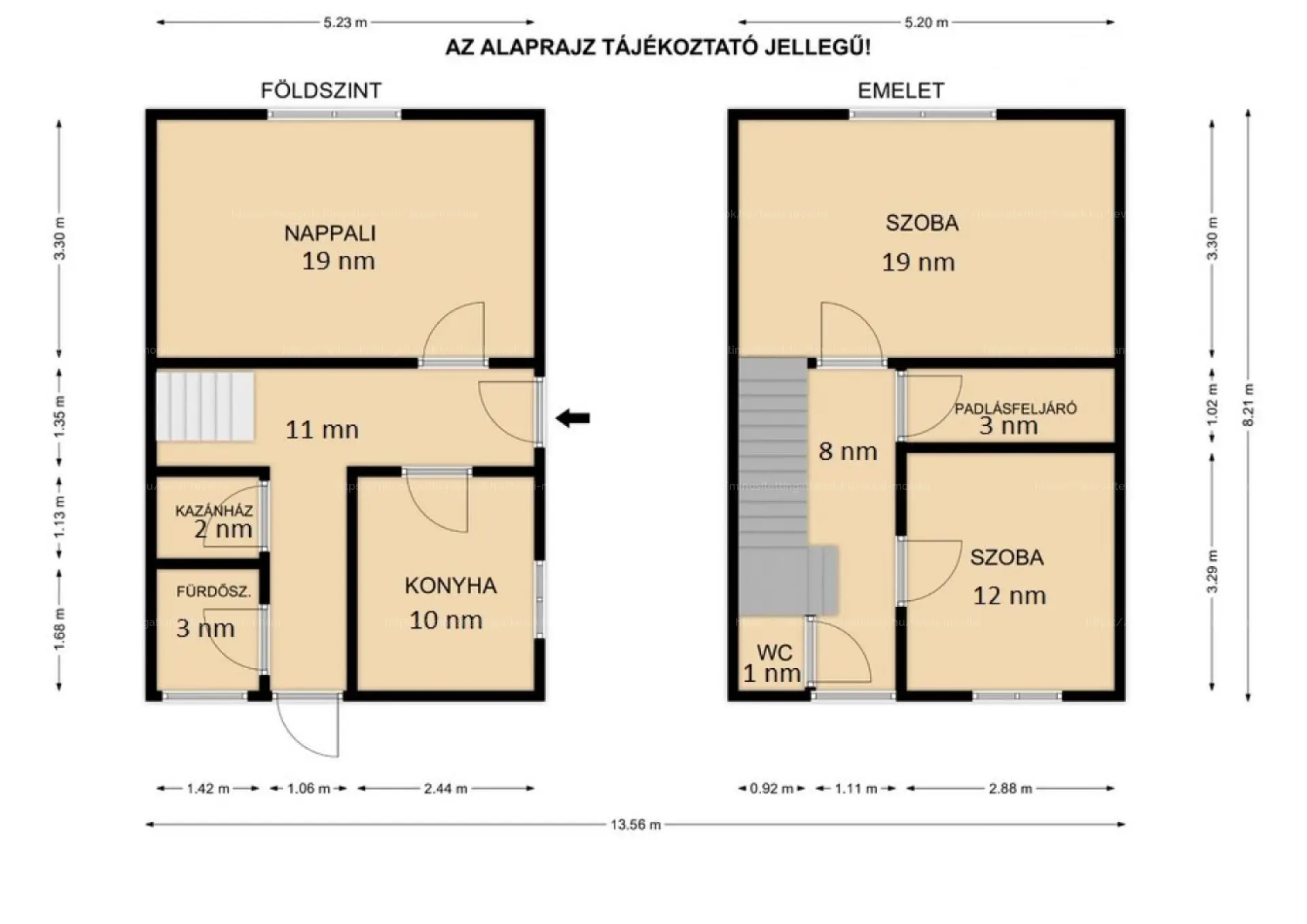 Részenként földszinten egy szoba (nappali), konyha, fürdőszoba, kazánház került kialakításra, az emeleten pedig 2 szoba, WC illetve a padlásfeljáró.