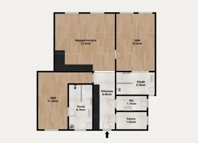 A nappali-konyha és a két külön nyíló hálószoba ideális elrendezést ad pároknak vagy családoknak.