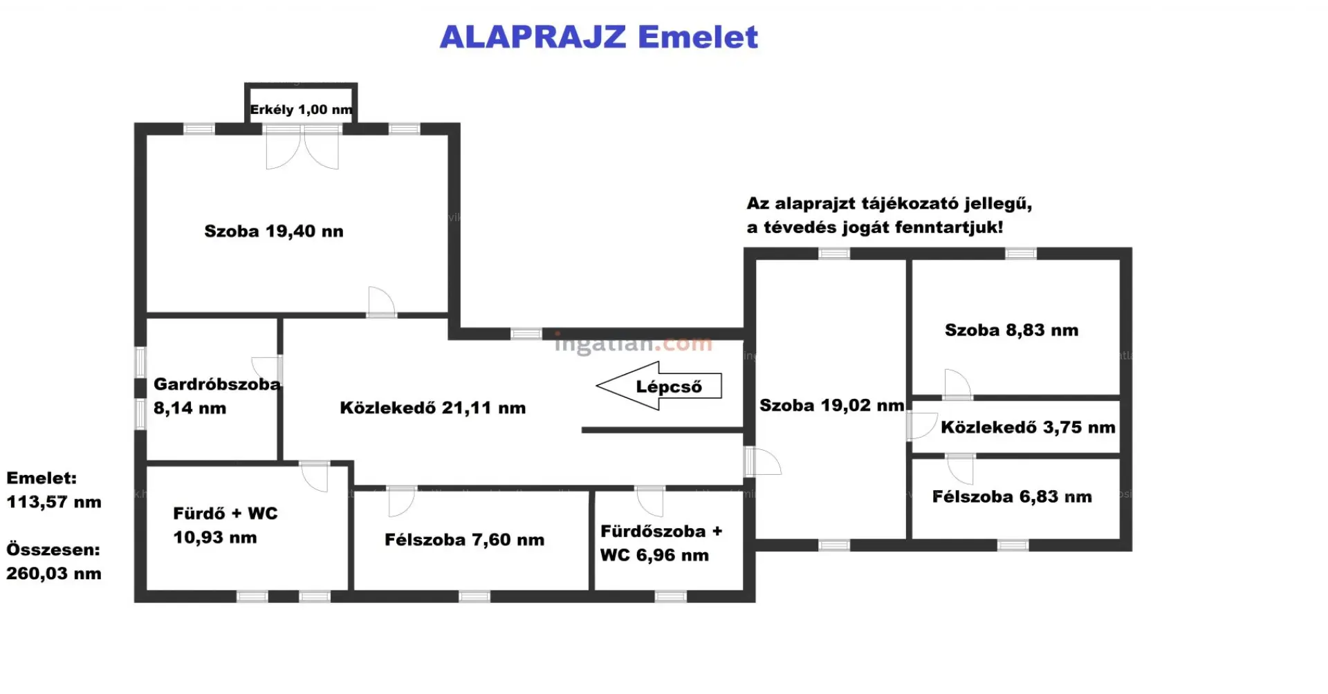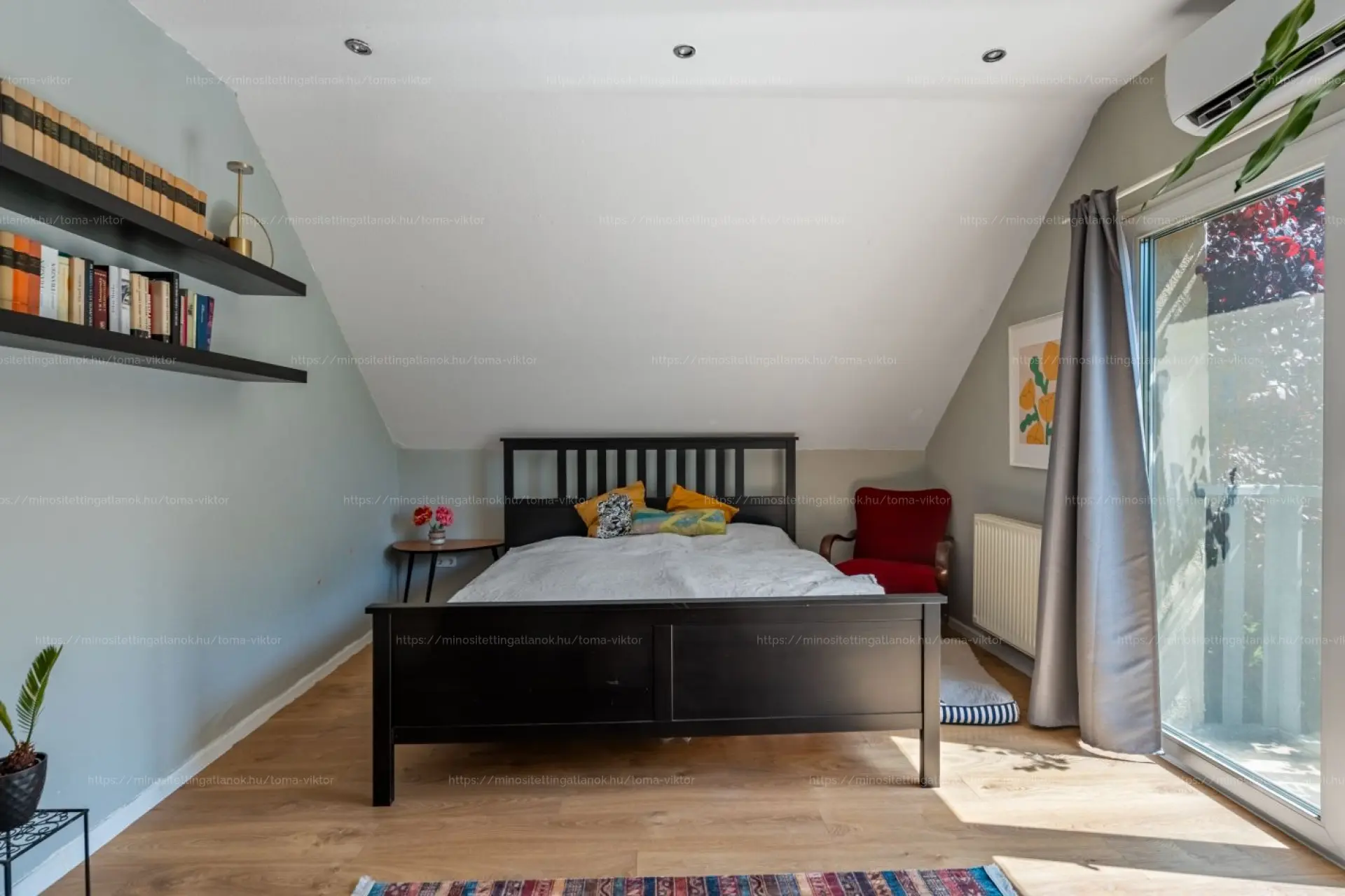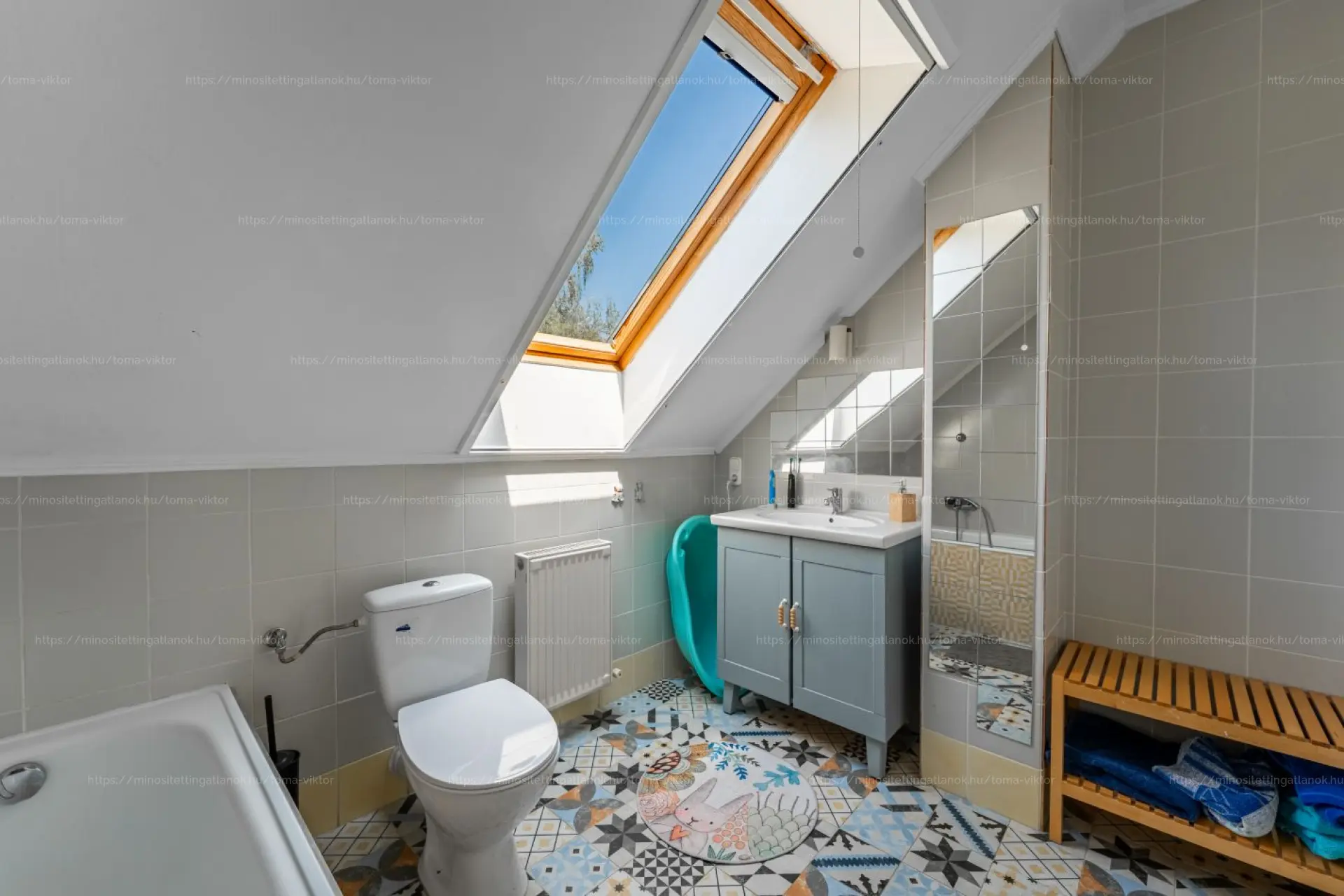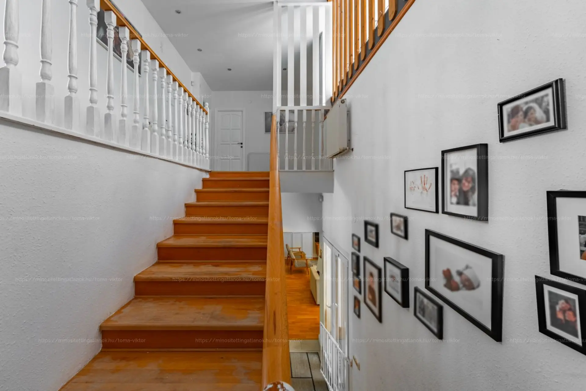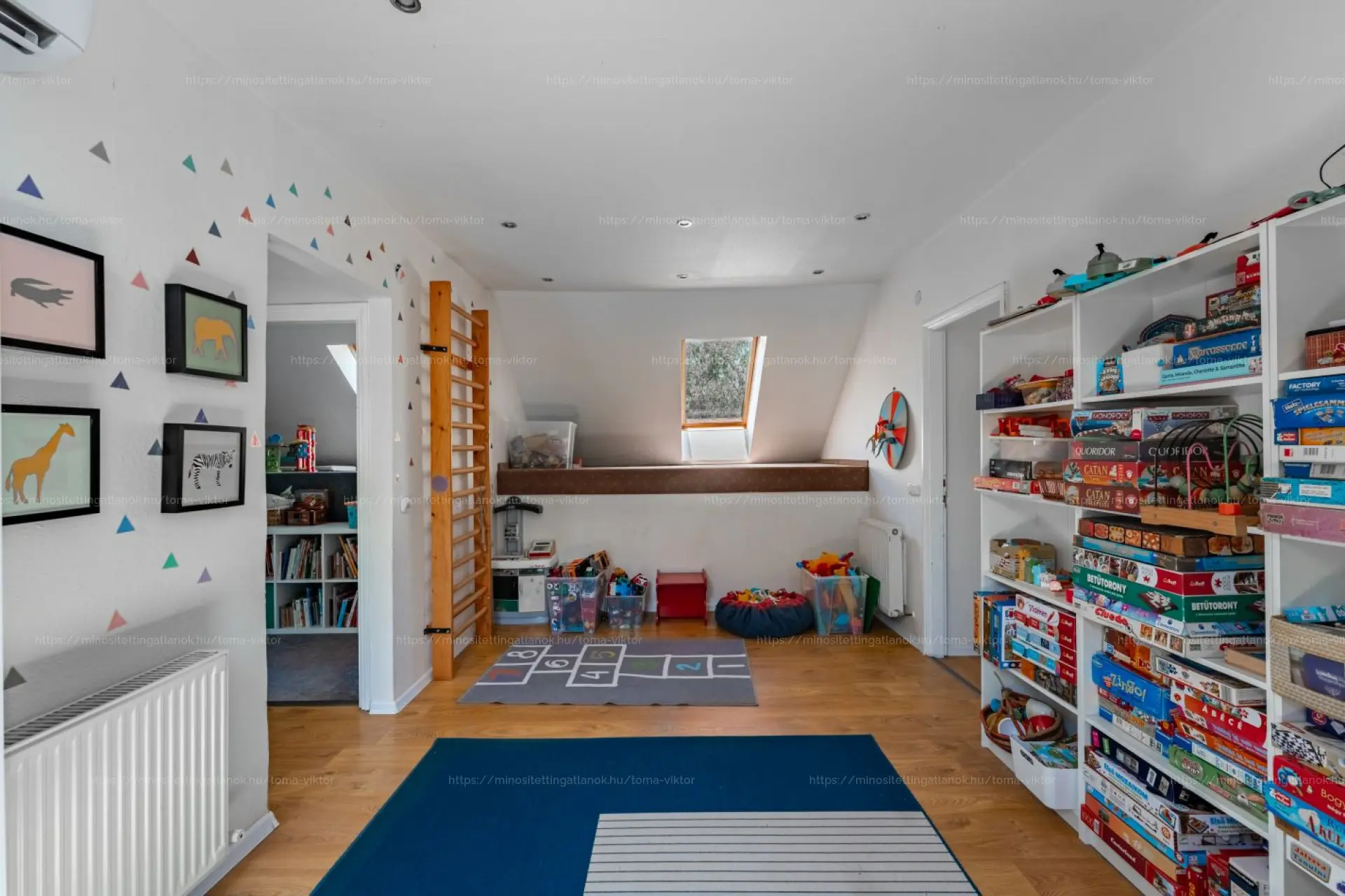 Felső szint: világos közlekedő, GARDRÓBSZOBA, erkéllyel rendelkező szülői háló, tágas fürdő sarokkád+WC, félszoba, kisebb fürdő+WC, világos gyerekszobaból nyíló két kisebb helyiség (vendég/dolgozó/gyerekszoba lehetőségek).