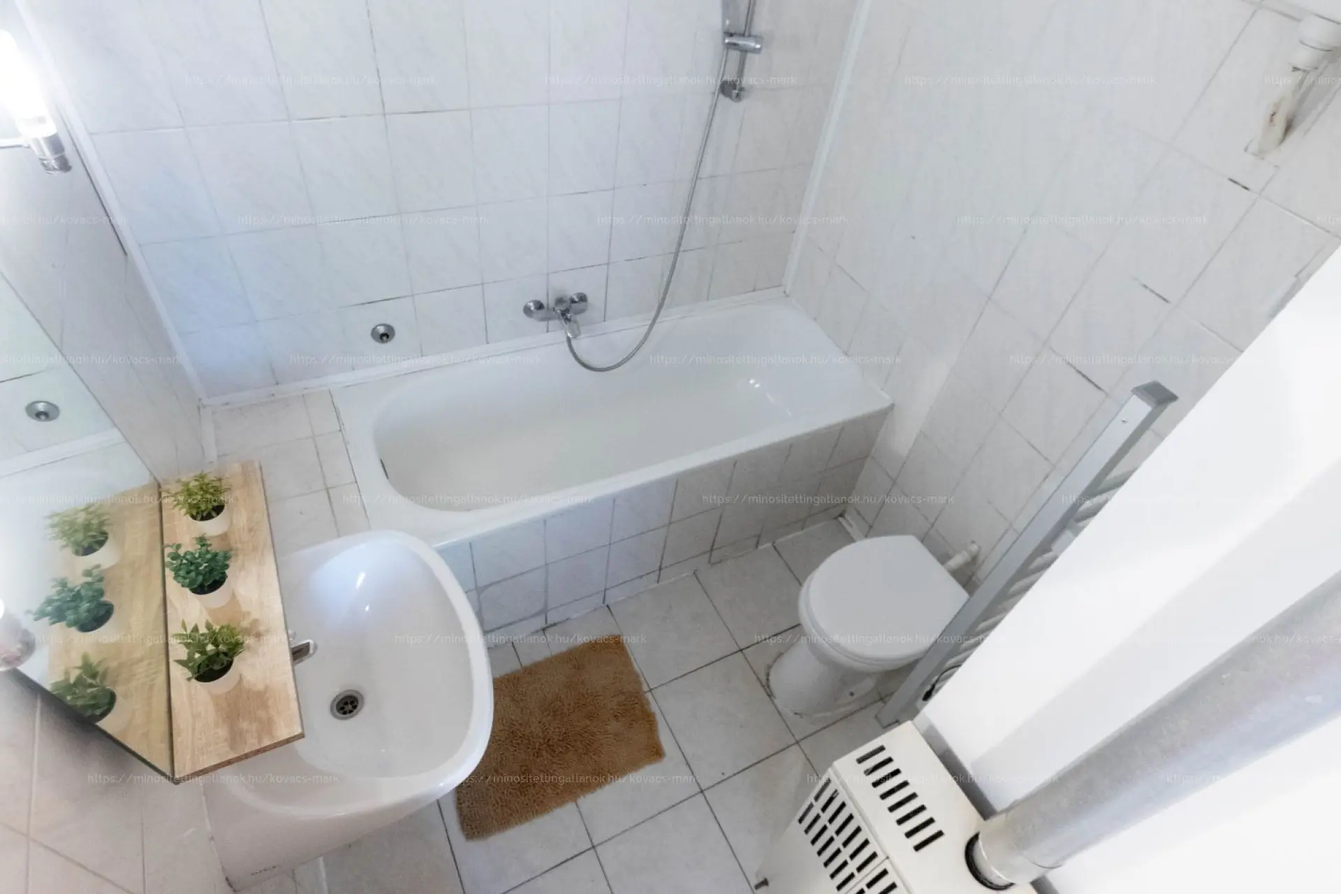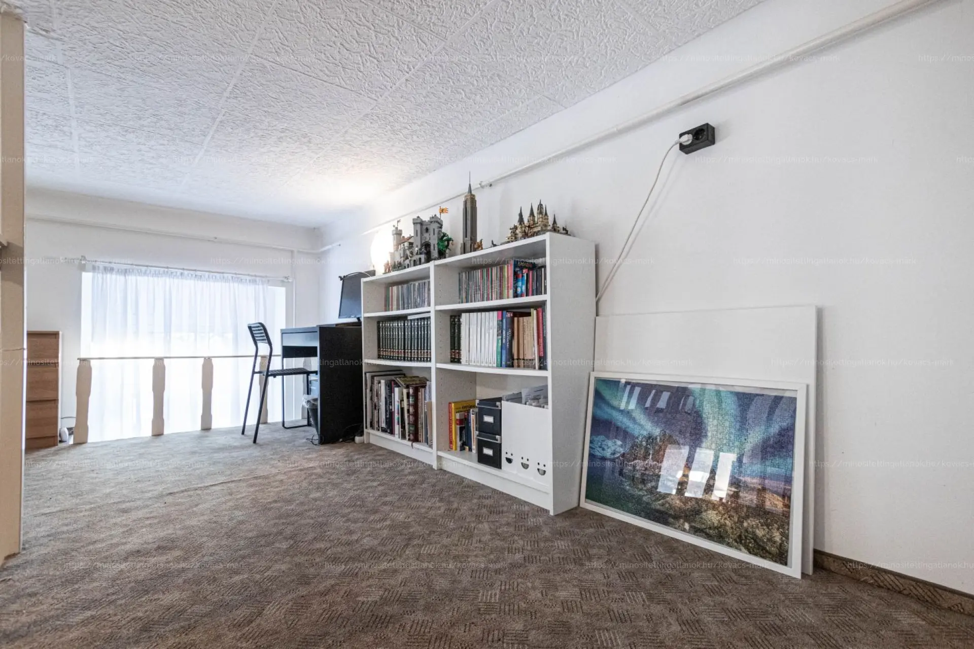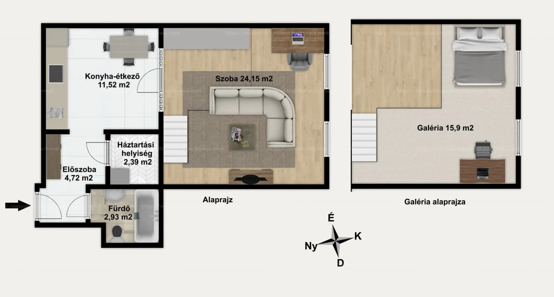 előszoba, étkezős konyha, galériás (1.65 belmagasságú,16m2-es) nappali, kádas fürdőszoba és tároló/háztartási helység.