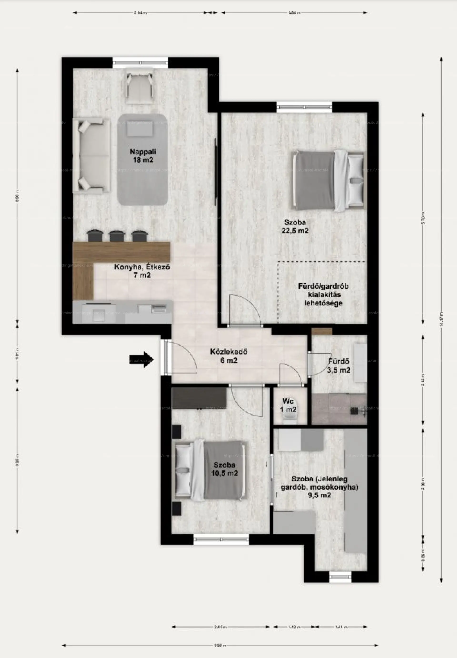 - Nappali + 2 szoba + 1 félszoba + 1 fürdő, de igény esetén egy 2. kialakítható (alaprajzon látható)