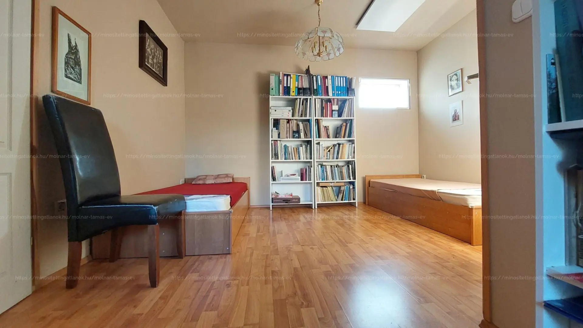Emelet: natúr falépcsőn át érünk fel a tetőtérbe, ahol összesen 3 hálószoba, egy fürdőszoba + wc, illetve gardrób található.