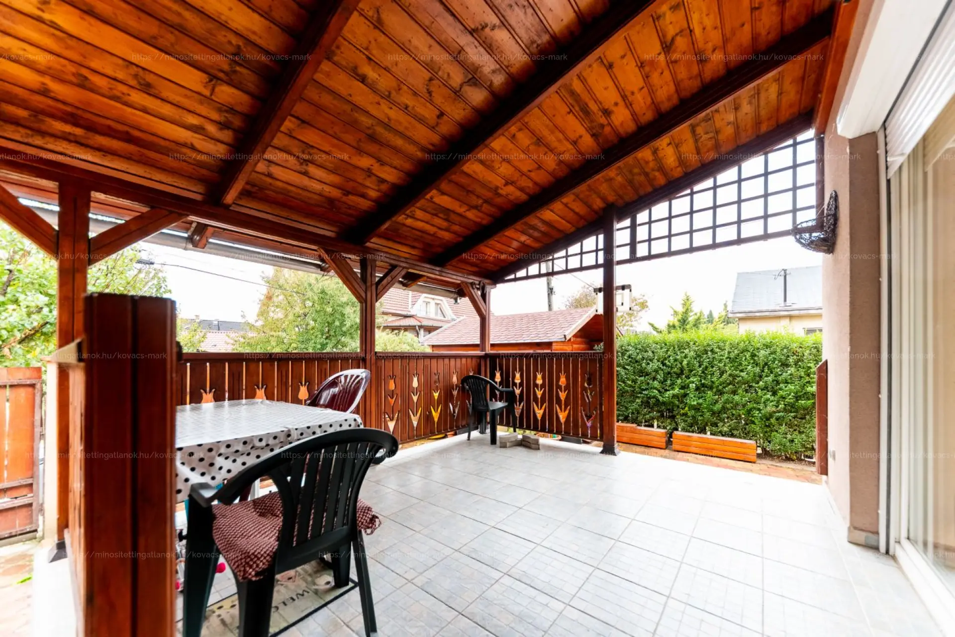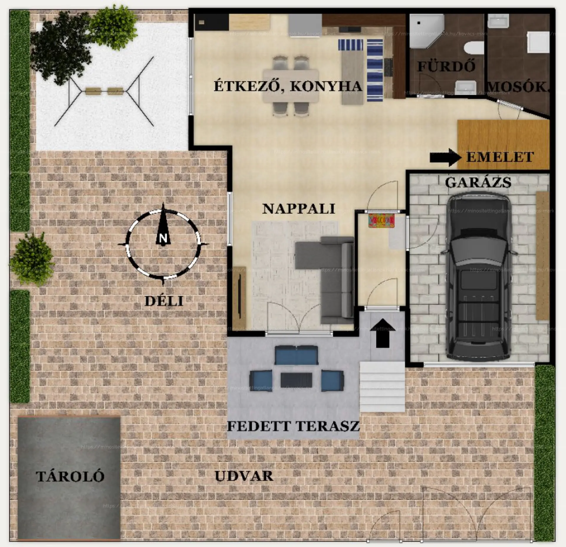 Fedett terasz,előszoba/szélfogó, amerikai konyhás nappali, kamra,előszoba, zuhanyzós fürdőszoba, 30nm-es, 1 autó számára elegendő garázs .