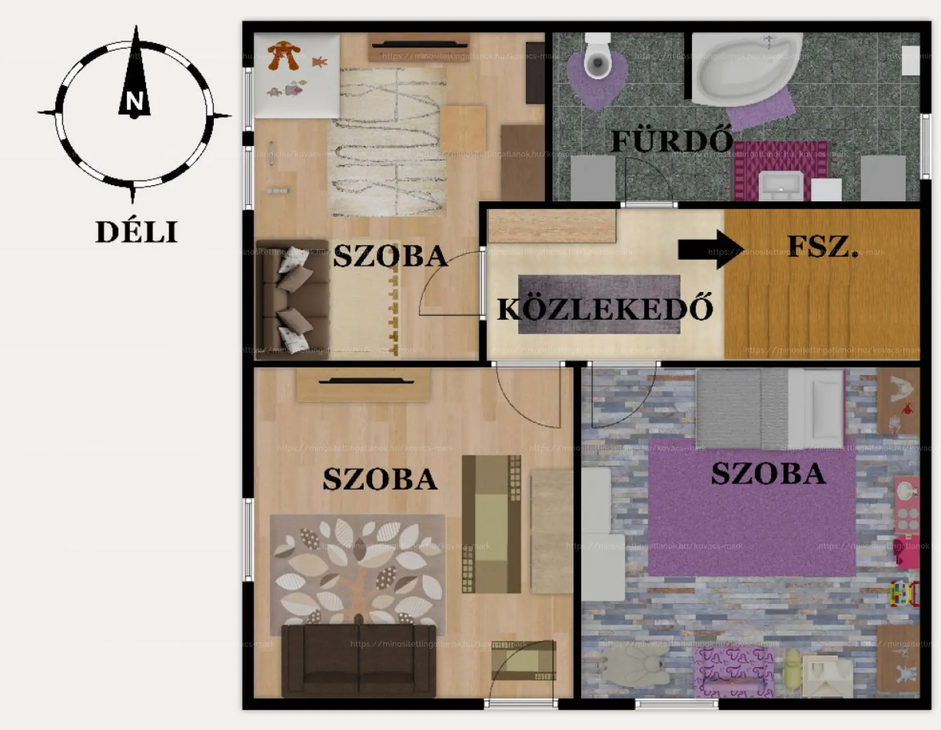 Közlekedő,3 különnyíló hálószoba,gardrób/dolgozó, kádas fürdőszoba.
