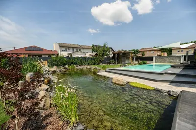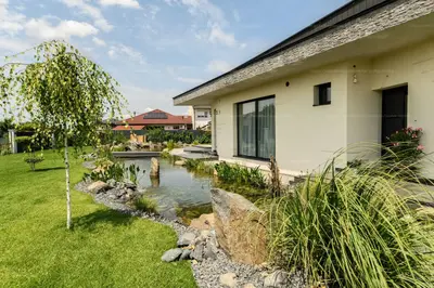 •A gondozott kertben egy 15x4 méteres, LEDVILÁGÍTÁSSAL, vízeséssel ellátott 60m2-es medence, valamint 30 méteres, öntisztuló kerti tó is helyet kapott.
