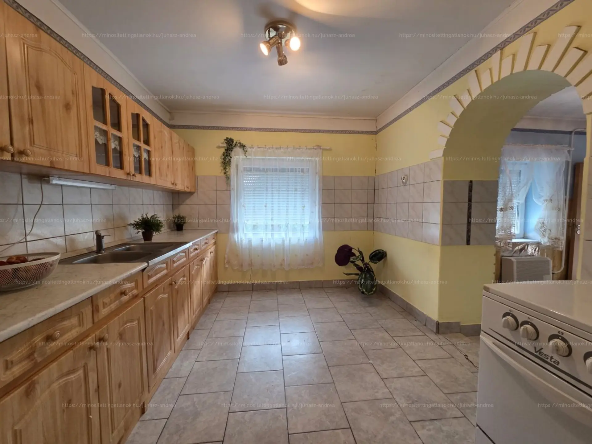 Bennem két kényelmes szoba vár, a konyha és az étkező pedig boltívvel egybenyitva – itt jólesik együtt lenni, beszélgetni, főzni.