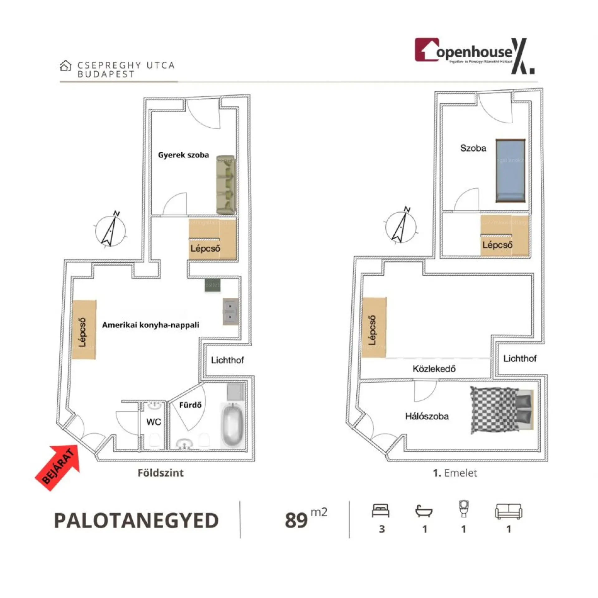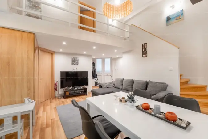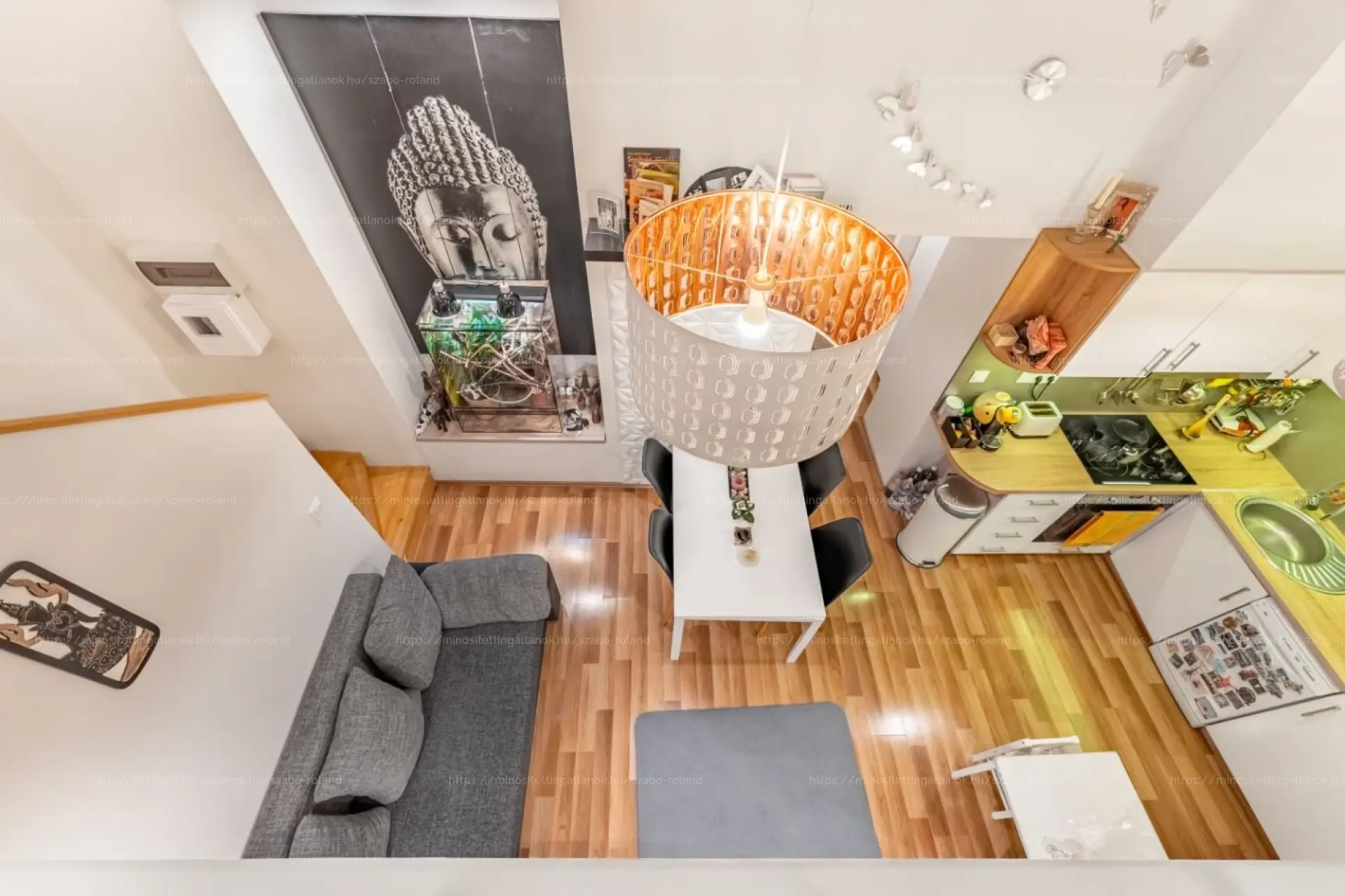 -Alapterület: Ez az ingatlan hivatalosan 49 négyzetméteres, azonban a praktikus belső kialakításnak köszönhetően a hasznos alapterület eléri a 89 négyzetmétert. A belső első emelet egy stabil, jól megtervezett galériás szint, amely további 40 négyzetméternyi életteret biztosít.