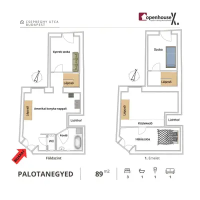 -Szobák száma: 3 (amerikai konyhás nappali + 3 hálószoba)