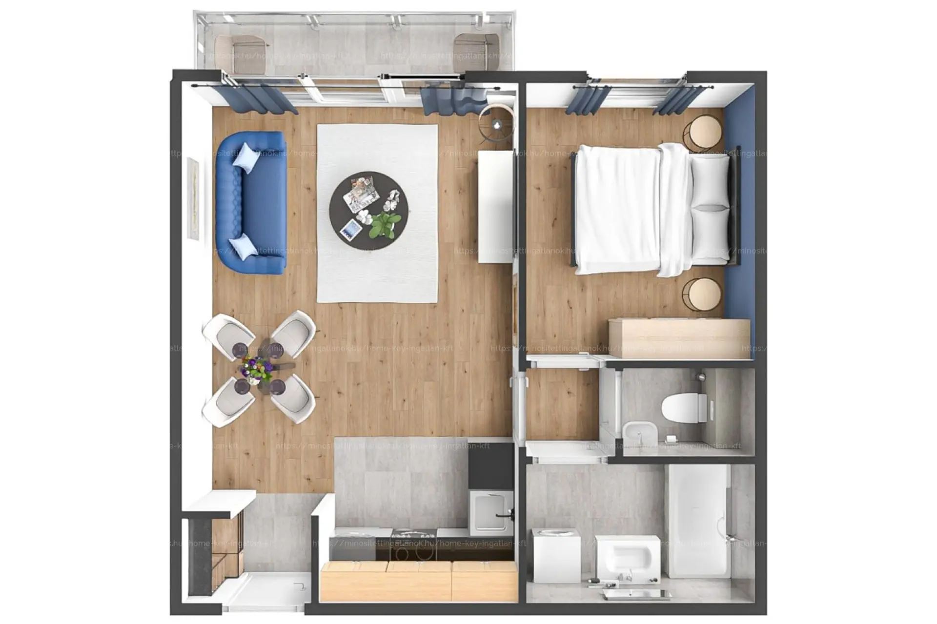 - Amerikai konyhás nappali + külön nyíló hálószoba