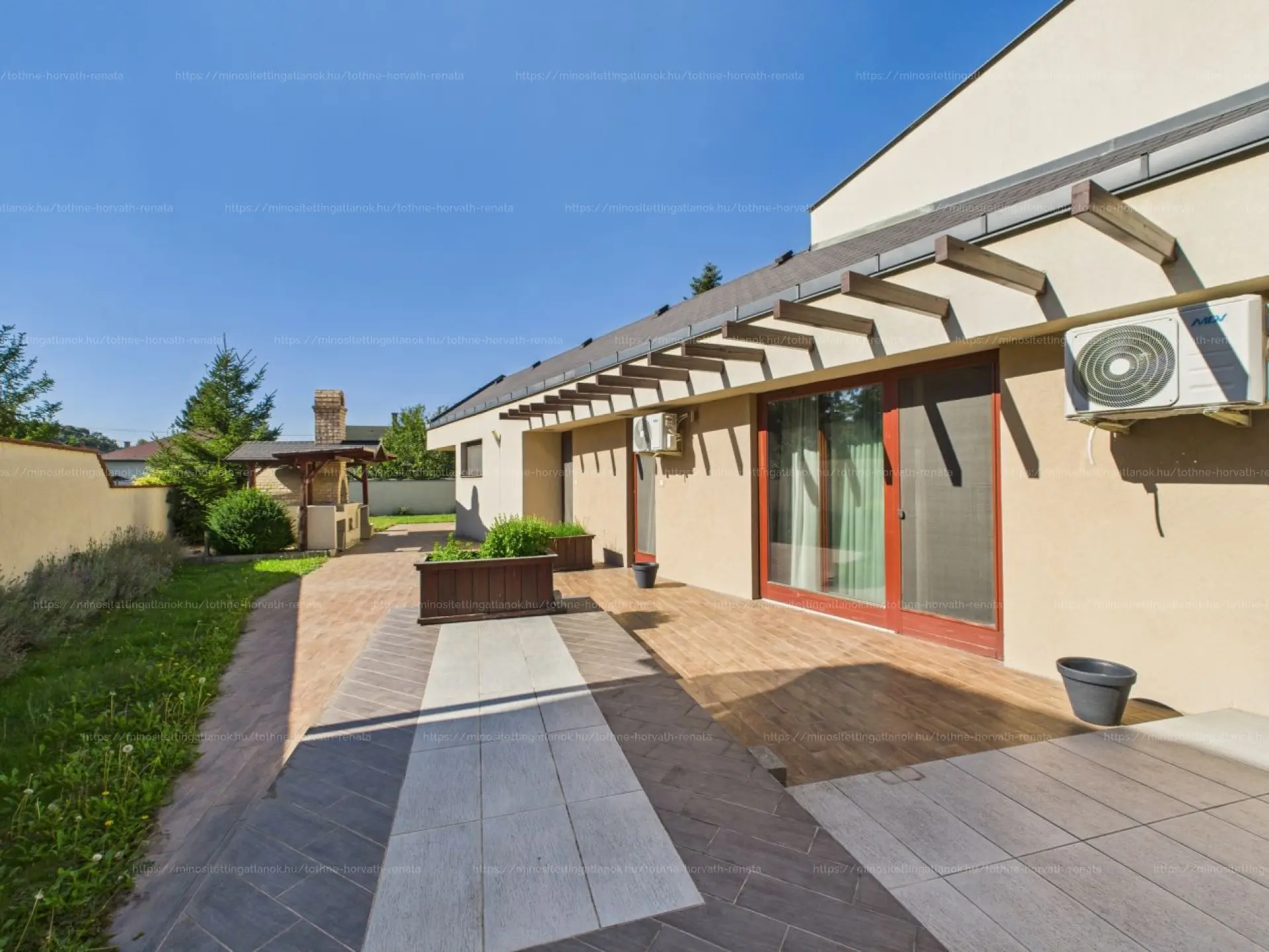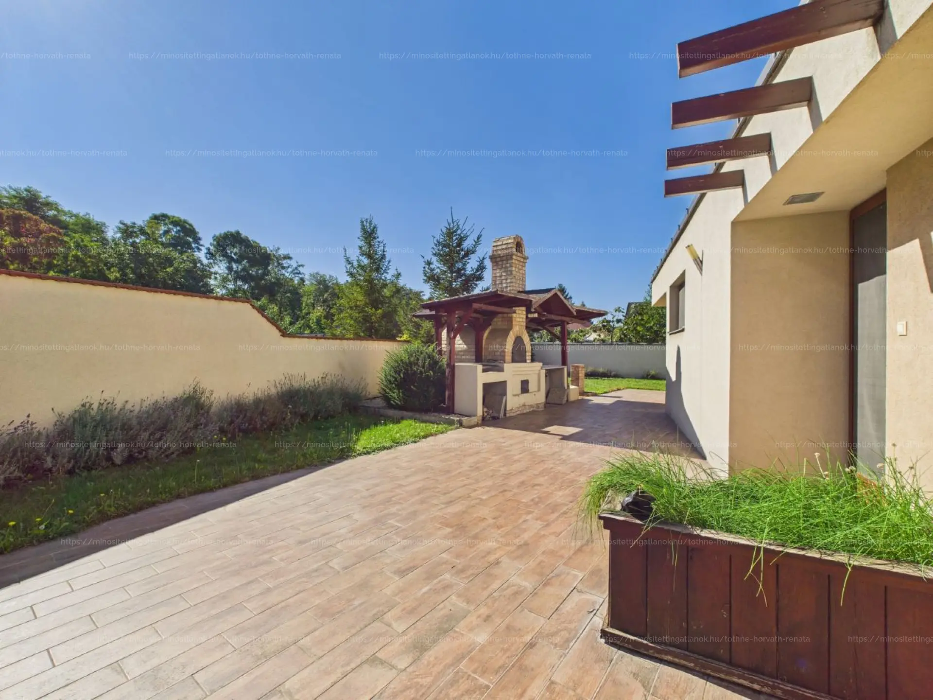 A közel 120 m²-es teraszon egyedi gasztrosarok, kiépített KEMENCE, grillező és előkészítő felületek várják a családi rendezvényeket vagy baráti összejöveteleket. A kert NYUGALMAT ÁRASZT, a magaságyásokban friss fűszernövények nőnek, amelyek hangulatot és kulináris élményt adnak a mindennapokhoz.