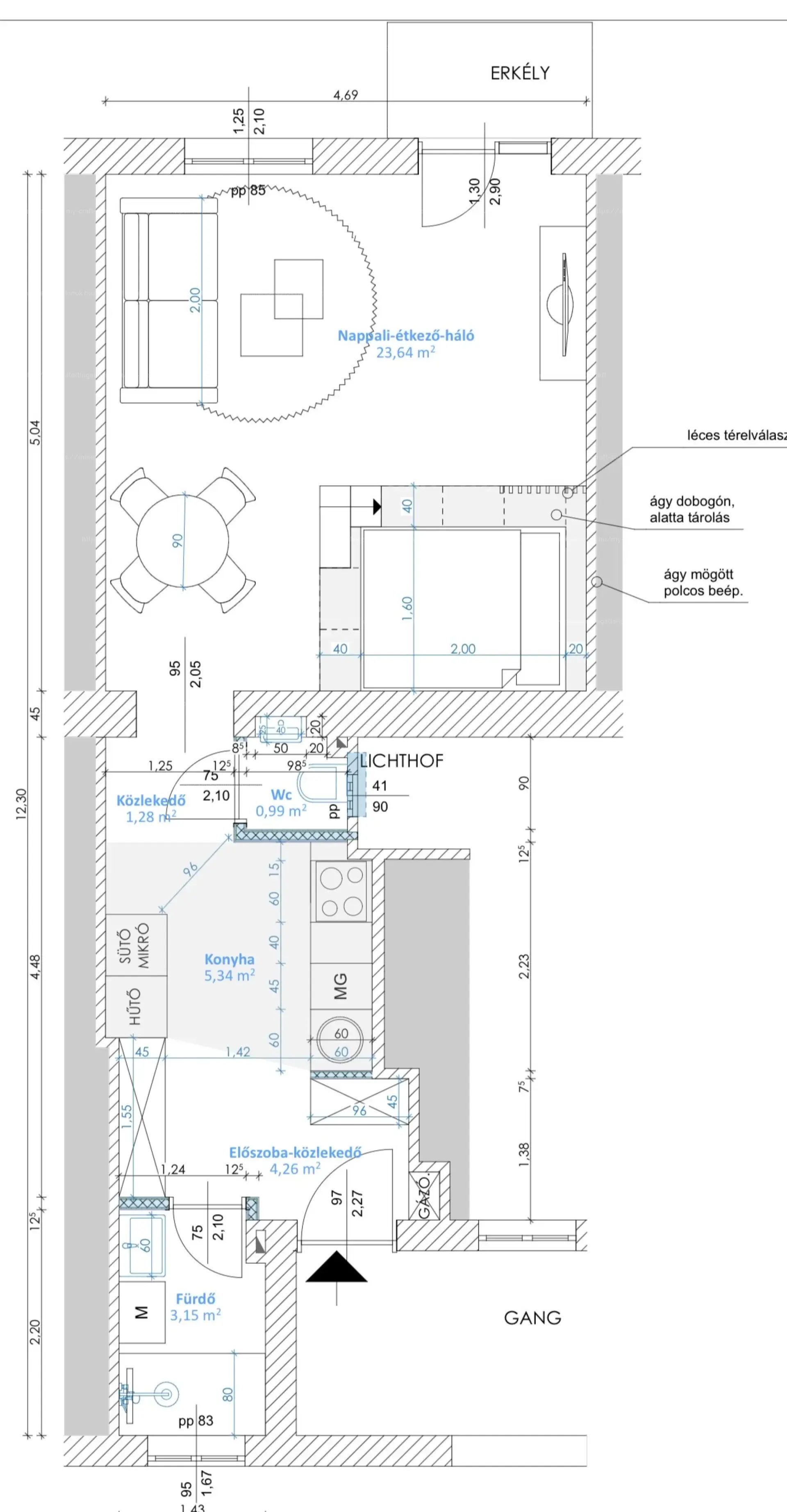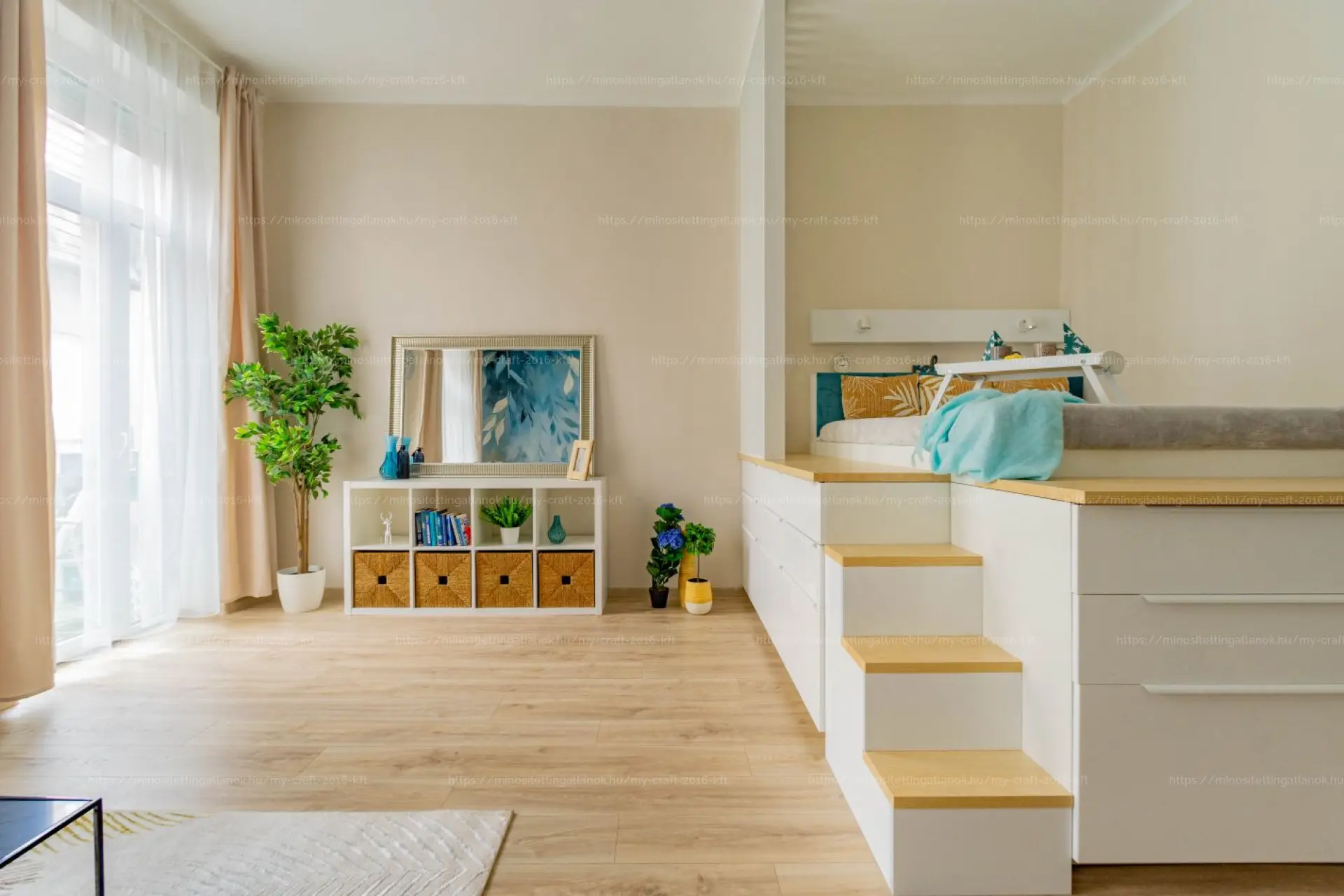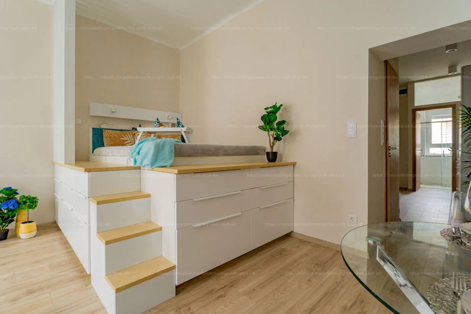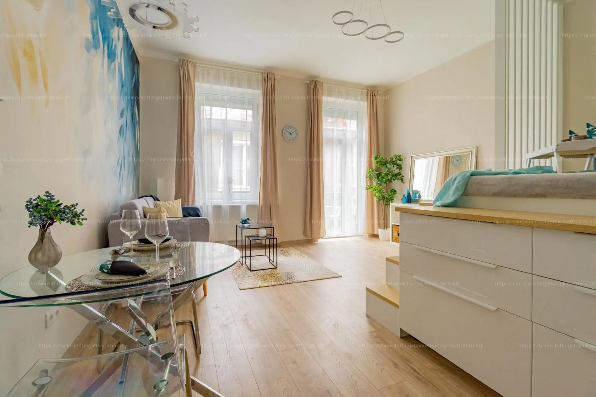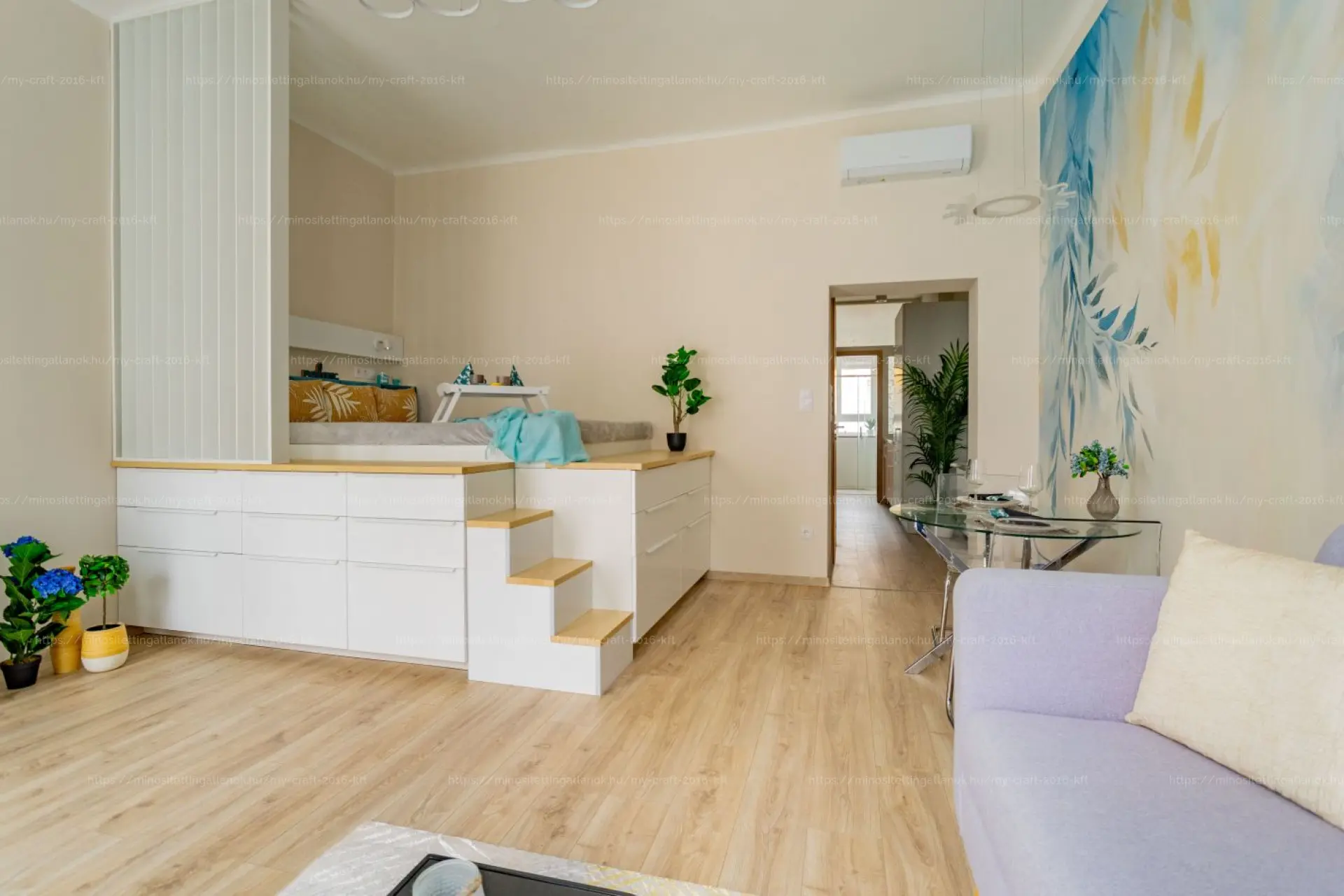 Az ingatlan felújítása során módosítottuk az alaprajzot, így a lakás belső elrendezése kiváló. A legoptimálisabb helykihasználás végett az ágyat megemeltük, alá a ruhák tárolására alkalmas szekrényeket tettünk. A fürdő és a wc külön helyiségben található, a fűtésről kondenzációs cirkókazán gondoskodik. A 3 nm-es erkély a csekély forgalmú, egyirányú utcára néz.