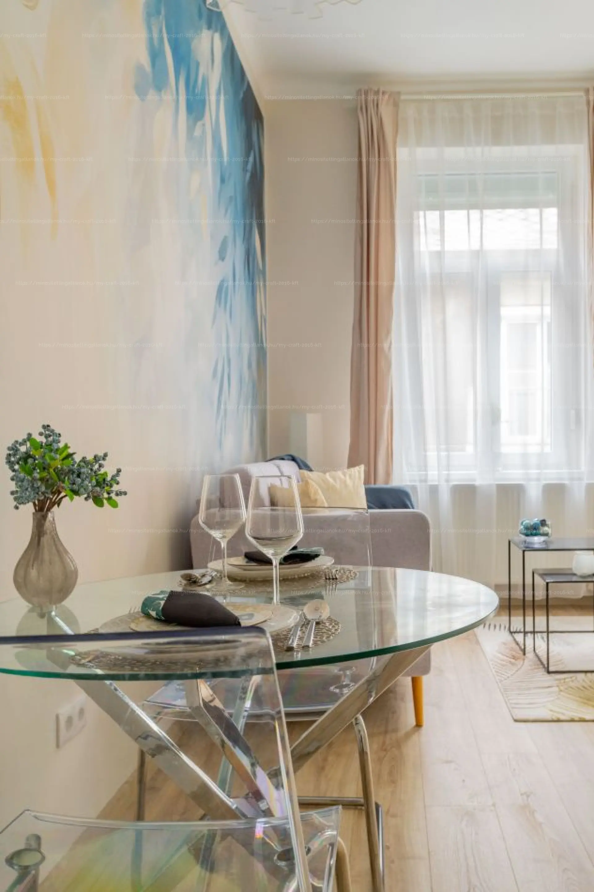 A lakás a liftes társasház második emeletén van, kelet-nyugati tájolású, kifejezetten csendes, világos, besüt a nap. A lakóház tiszta, rendezett, a lakóközösség kulturált. A lokáció zseniális, a Corvin Plázától 200 méterre, a nyüzsgő belvárosban található, mégis egy nyugis kis utcában. Metró, 4-6-os villamos, buszok, éjszakai járatok, minden megtalálható, ami kell.