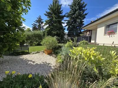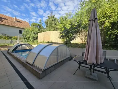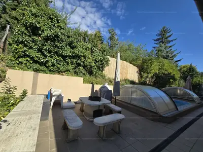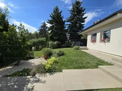A KERT 643 nm, PARKOSÍTOTT, öntözése külön vízórás kerti csapról megoldott; hátsó részen grillező, továbbá GÉPESÍTETT, FEDDETT KÜLTÉRI MEDENCE. A környék KULTURÁLT, ÖSSZETARTÓ lakóközösség; tömegközlekedés KIVÁLÓ (kék és sárga busz megálló néhány perc sétára), bolt, játszótér, iskola, óvoda, bölcsőde a közelben.