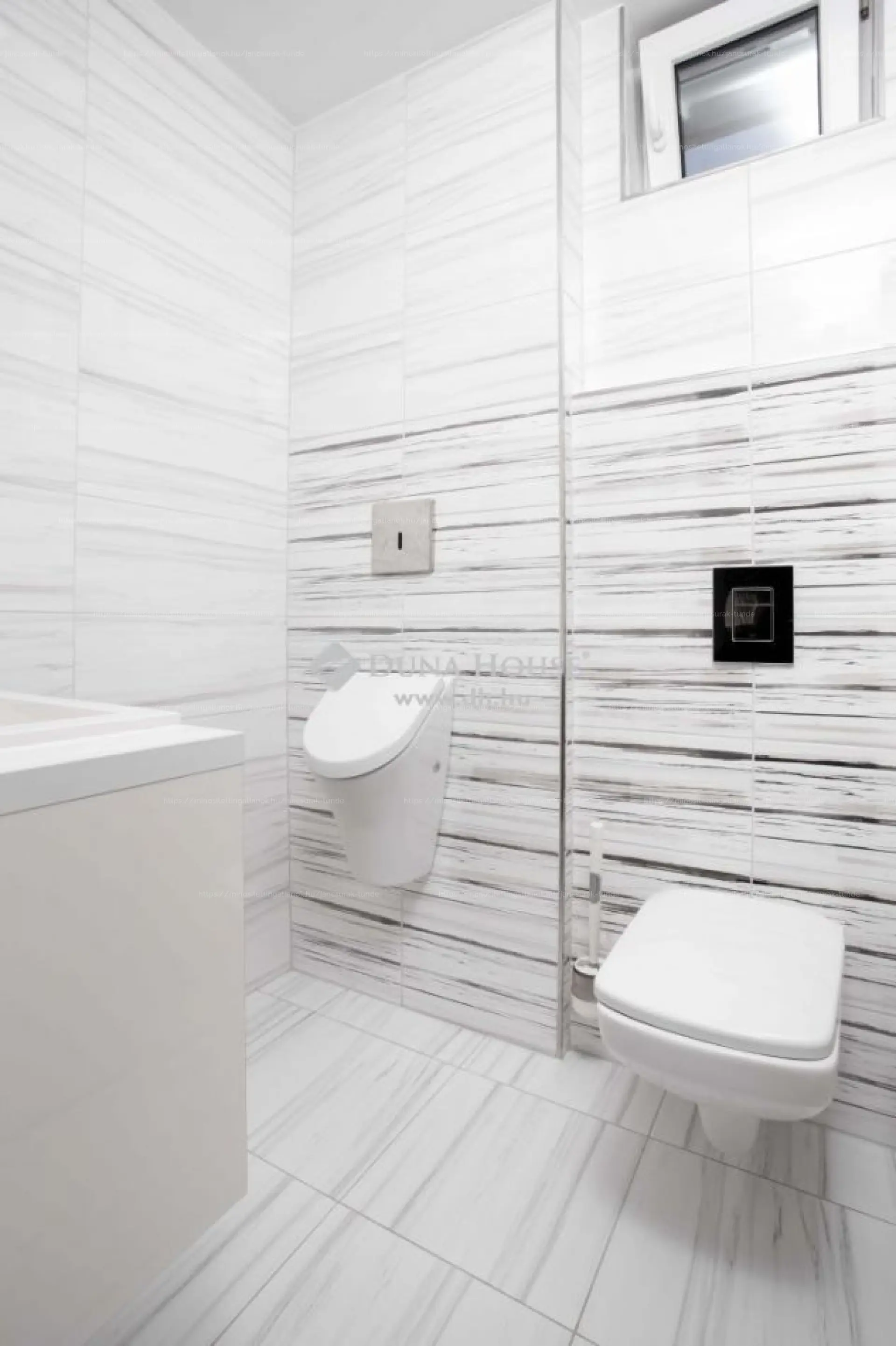 - Modern fürdőszoba: perem nélküli antibakteriális COLO Wc, automata Roca piszoár, Grohe csaptelepek, Radaway üvegzuhanyfal