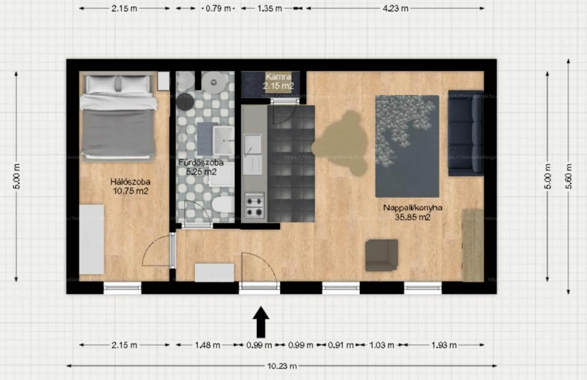 - 2 szoba (amerikai konyhás nappali + hálószoba)