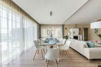 • Светлая гостиная-столовая, идеальная для семейных встреч и ужинов с друзьями, с атмосферным камином и большими стеклянными поверхностями, создающими естественную связь с садом