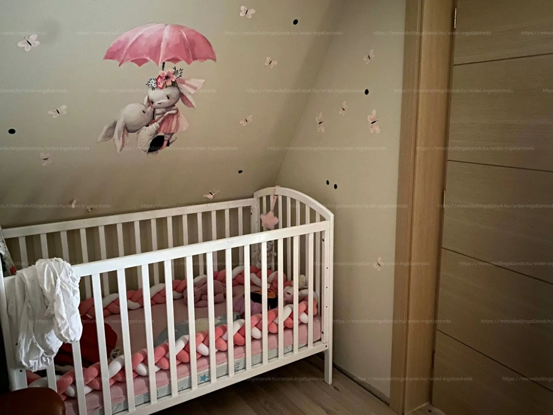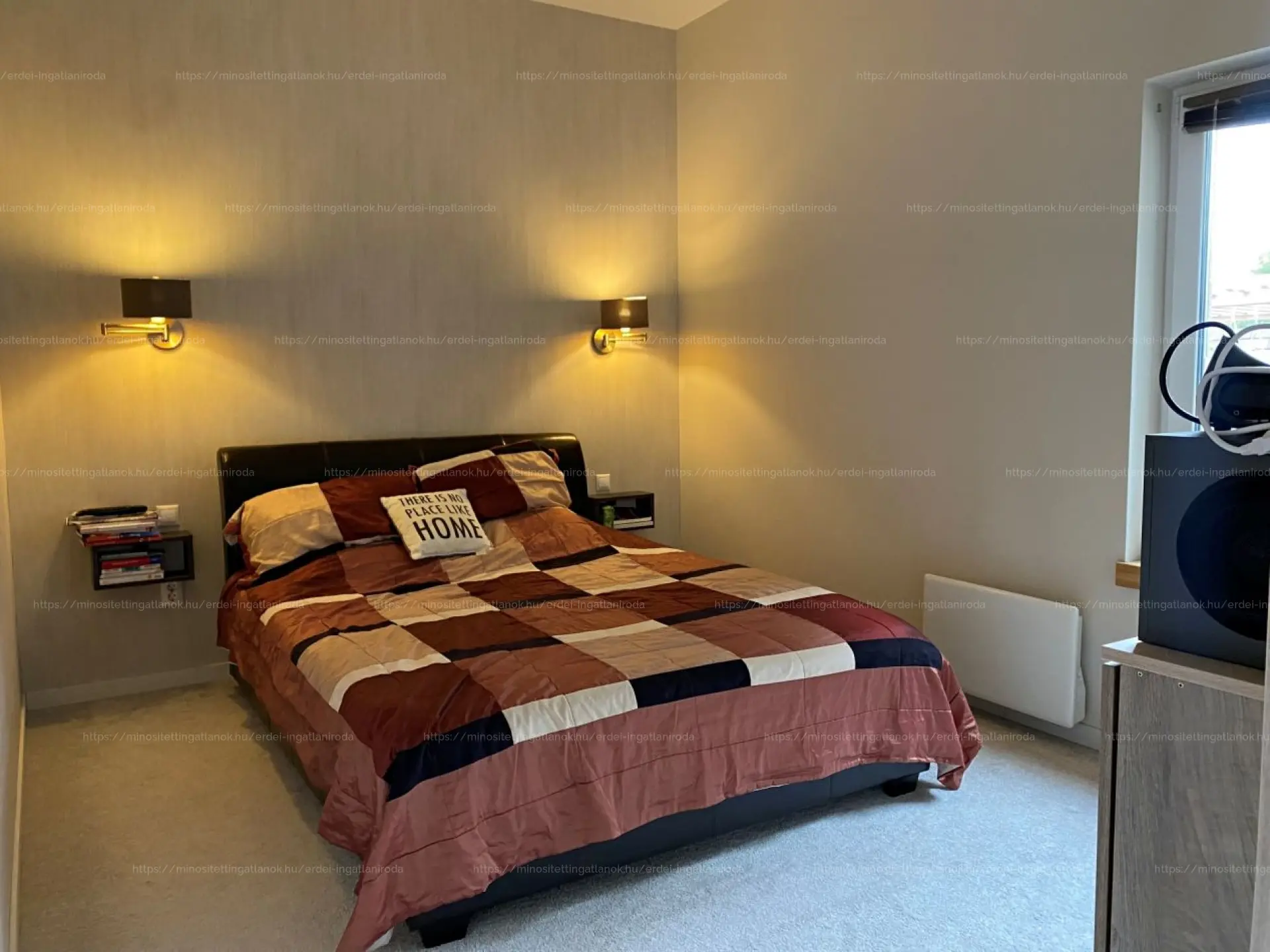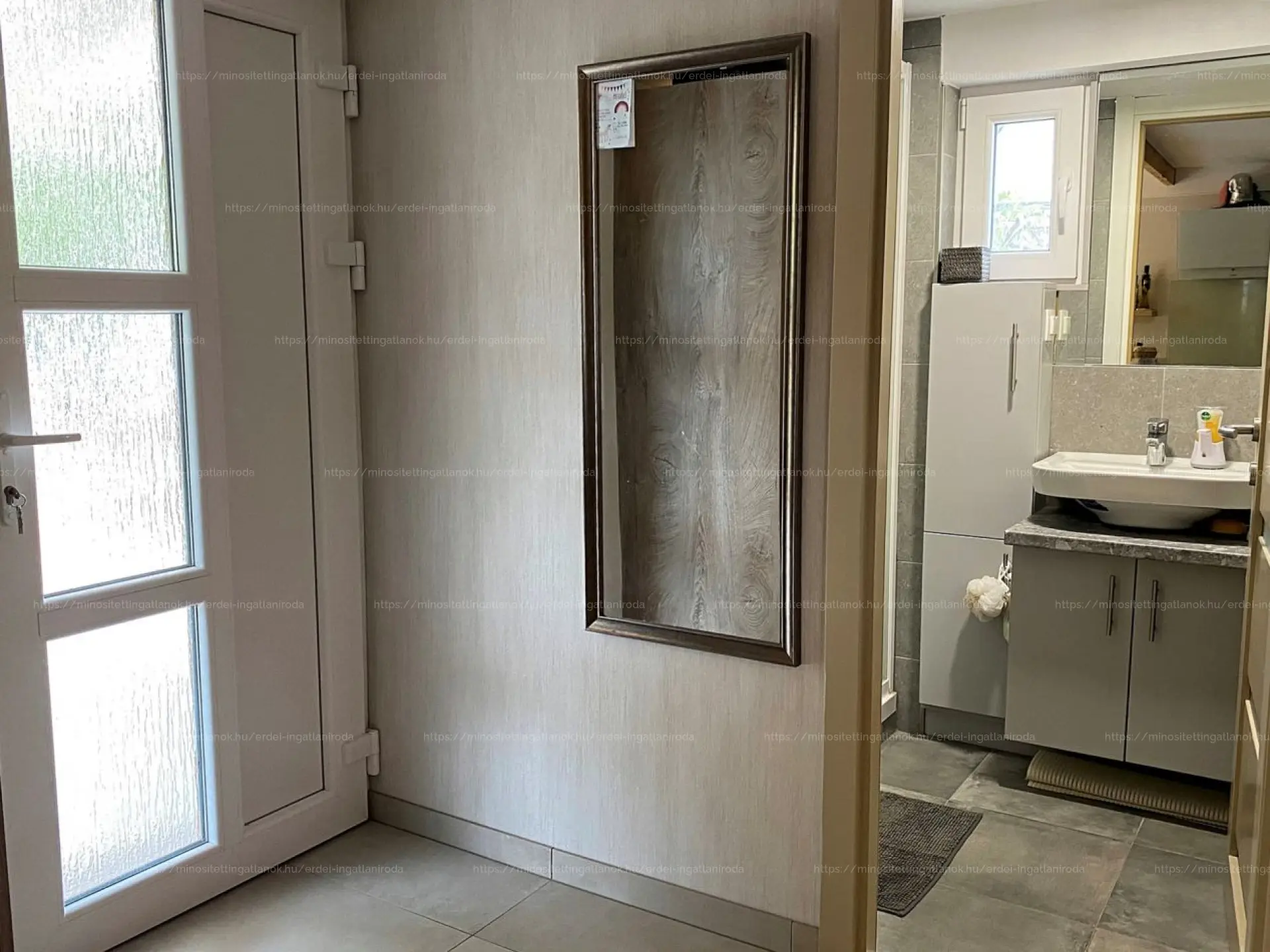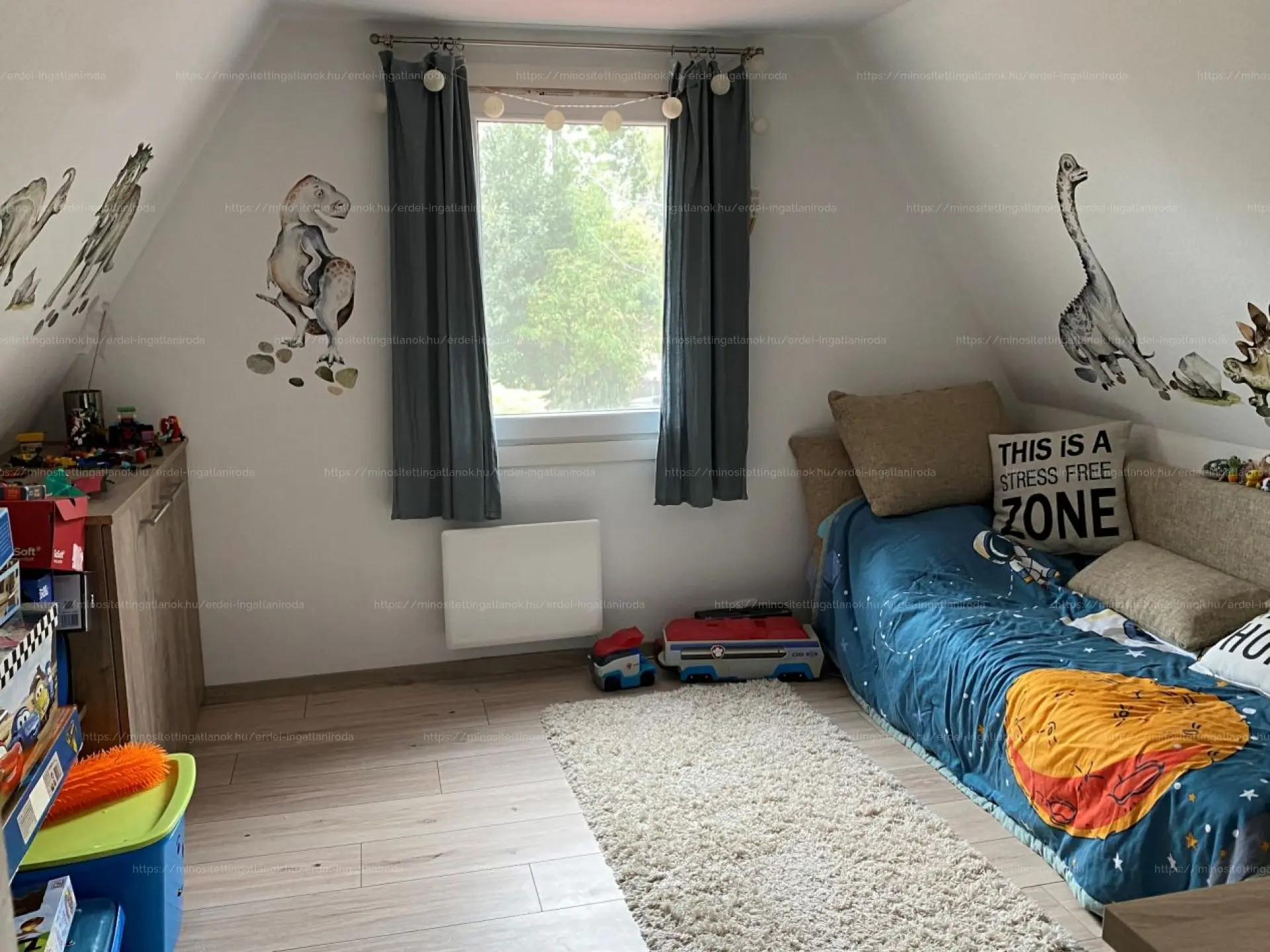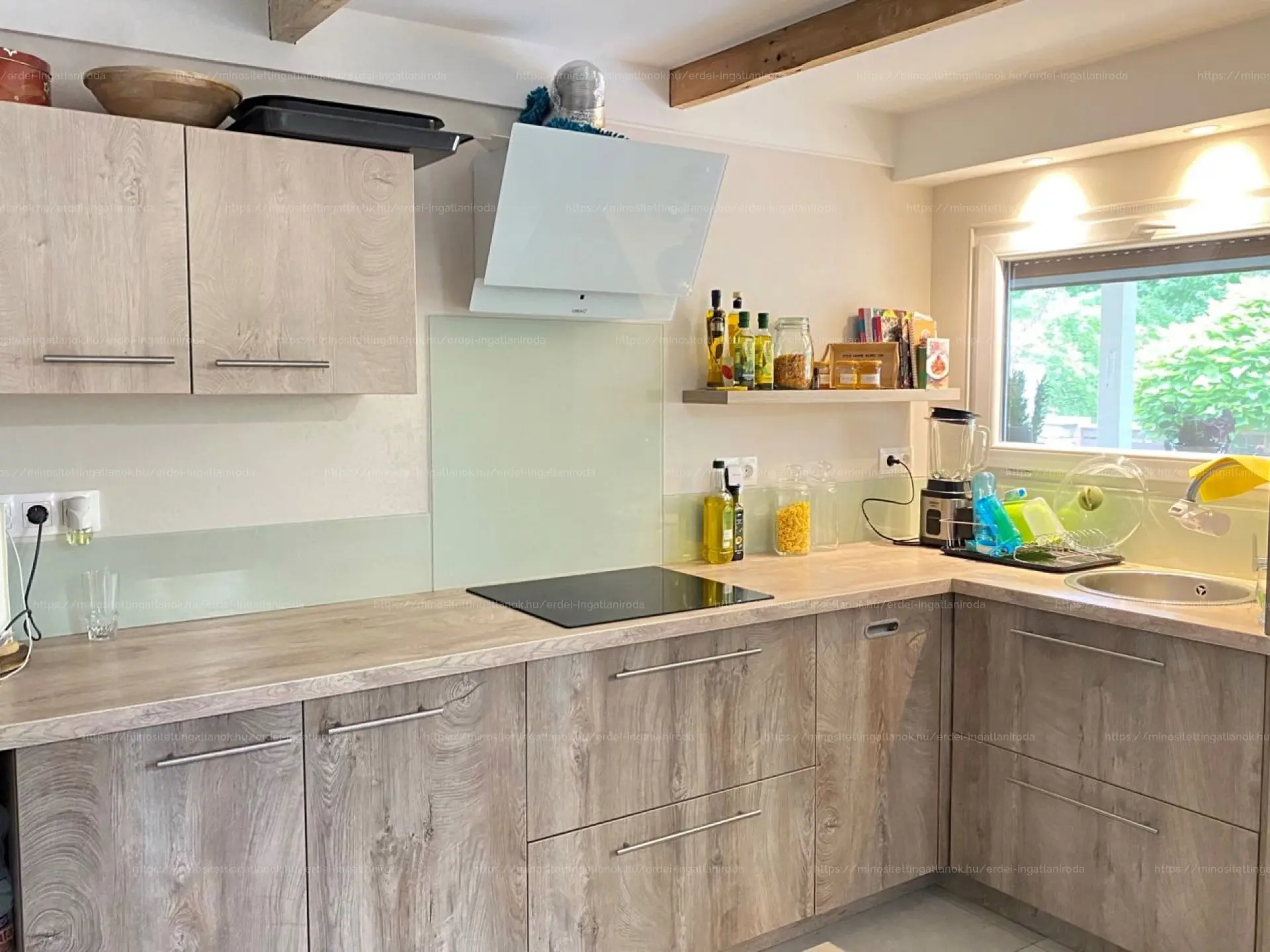 A földszinten a 15 m²-es fedett teraszról bejutva a konyhába érkezünk. Innen nyílik a fürdőszoba egy gardrób és egy külön WC helyiség. A konyhabútor az ár részét képezi. Tovább haladva egy tágas, látszó fagerendás nappali-étkezőbe jutunk, ahonnan nyílik egy gardróbszoba és onnan egy hálószoba. A gardróbból kijárási lehetőség van a hátsó kertbe. A fűtést padlófűtés, hűtő-fűtő klíma, és NOBO panelek biztosítják. A melegvíz-ellátás elektromos bojlerről üzemel. A 20 m²-es padlás pakolható, villannyal és szúnyoghálós műanyag ablakkal felszerelt. Az ingatlan tehermentes, a kiköltözés rugalmasan megoldható.