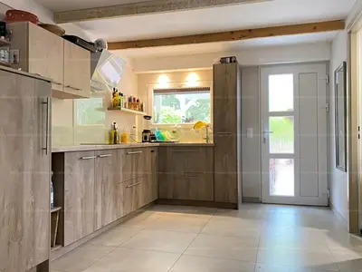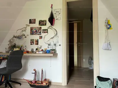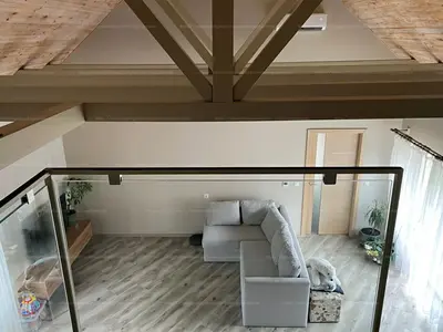 A földszinten a 15 m²-es fedett teraszról bejutva a konyhába érkezünk. Innen nyílik a fürdőszoba egy gardrób és egy külön WC helyiség. A konyhabútor az ár részét képezi. Tovább haladva egy tágas, látszó fagerendás nappali-étkezőbe jutunk, ahonnan nyílik egy gardróbszoba és onnan egy hálószoba. A gardróbból kijárási lehetőség van a hátsó kertbe. A fűtést padlófűtés, hűtő-fűtő klíma, és NOBO panelek biztosítják. A melegvíz-ellátás elektromos bojlerről üzemel. A 20 m²-es padlás pakolható, villannyal és szúnyoghálós műanyag ablakkal felszerelt. Az ingatlan tehermentes, a kiköltözés rugalmasan megoldható.
