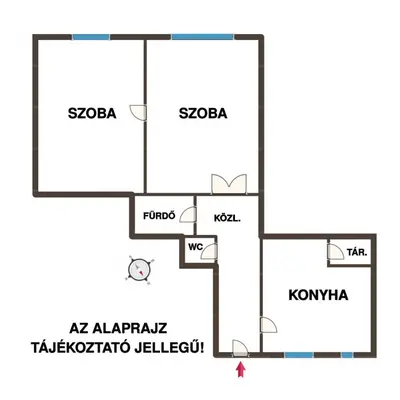 - Helyiségek: 2 szoba, konyha kamrával, fürdő WC-vel, közlekedő