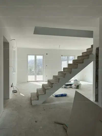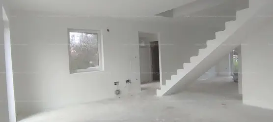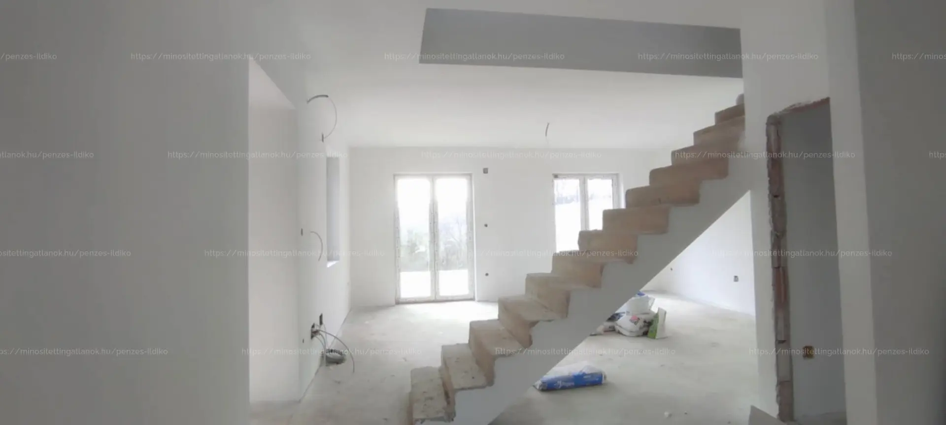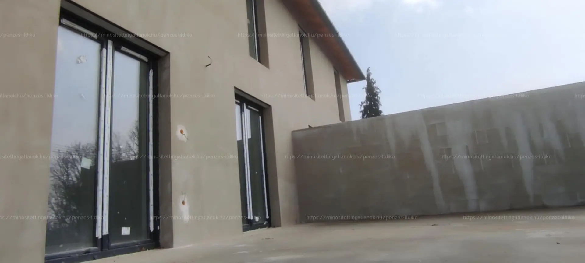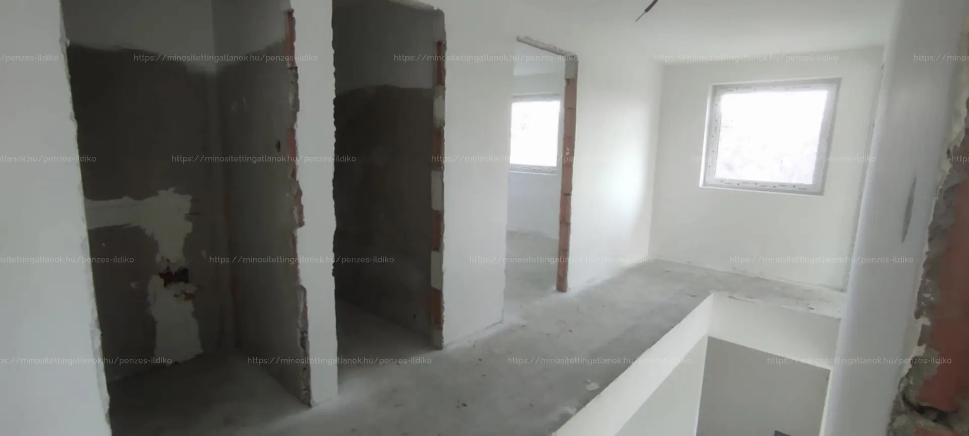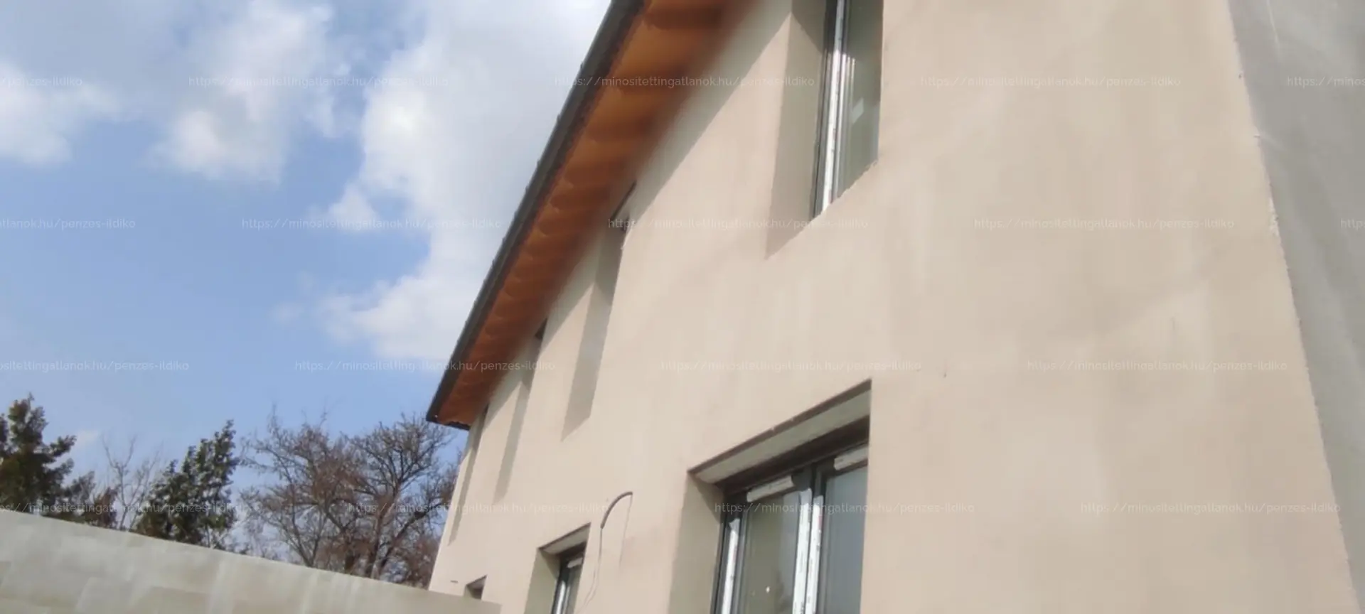 •Falazat: 30-as Porotherm tégla. Kívülről 15 cm-es DRYVIT. Felül 25 cm-es kőzetgyapot szigetelés. A válaszfal 10-es válaszfaltégla. Falak kétszer glettelve, fehér színre festve.