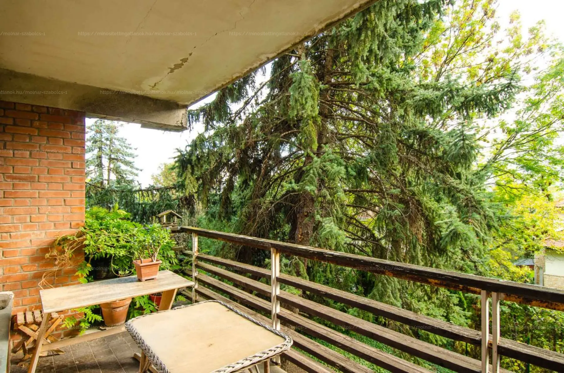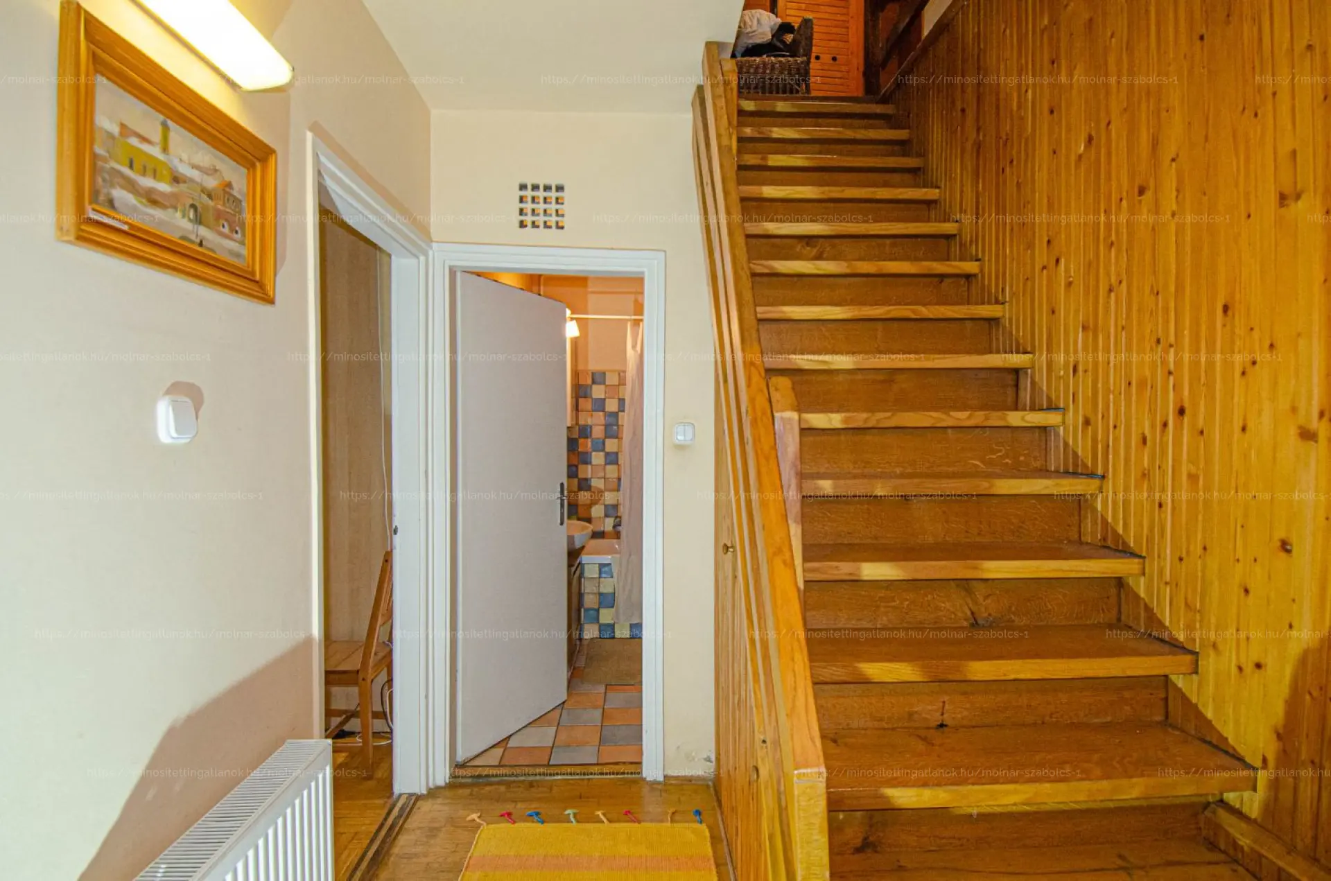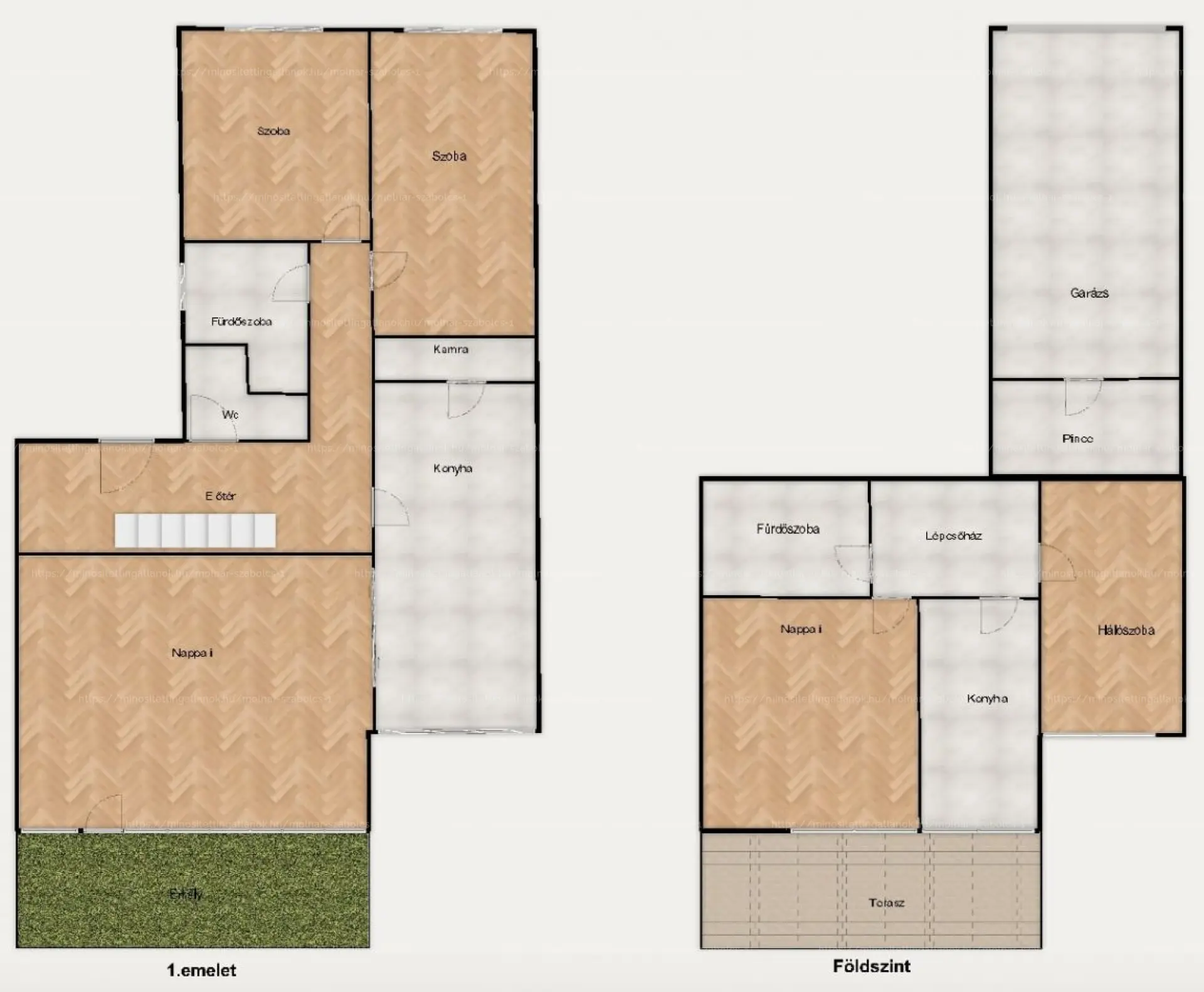Felső szint (80 m²): nappali, két hálószoba, konyha, kamra, fürdőszoba, külön WC és erkély.
