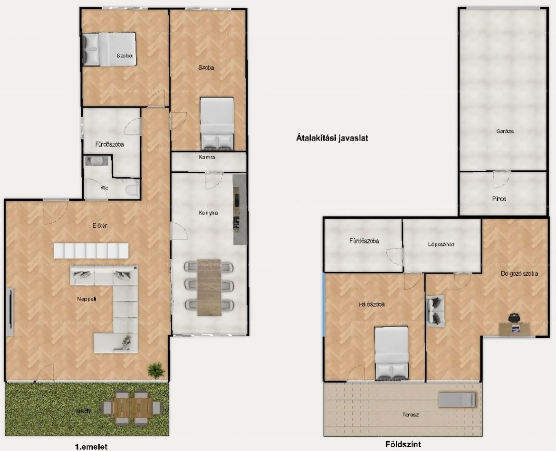 Alsó szint (42 m²): másfél szoba, konyha, fürdőszoba WC-vel és terasz közvetlen kertkapcsolattal.