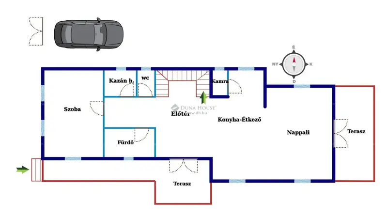 A ház több égtáj felé néző fedett terasszal rendelkezik, közel 50 nm-es nappali-étkező-konyhával, 4 nagyméretű hálószobával, 2 fürdőszobával és egy vendégmosdóval.