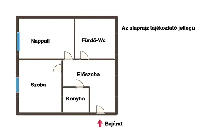 A lakás elosztása praktikus és otthonos: hálószoba, nappali, főzőfülke, valamint fürdőszoba (kádas) WC-vel.