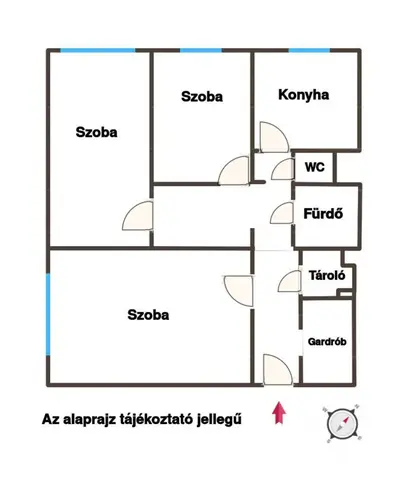 A lakás belső tere praktikus elrendezésű: a jobb oldali folyosón található a gardrób és egy kamra, míg a bal oldali részen a tágas, világos nappali várja új tulajdonosát. Tovább haladva a jobb oldalon helyezkedik el a fürdőszoba és a WC, szemben pedig a világos konyha. A fürdőszobával szemben a két külön bejáratú szoba található, így ideális elosztás egy család vagy több együtt élő személy számára.