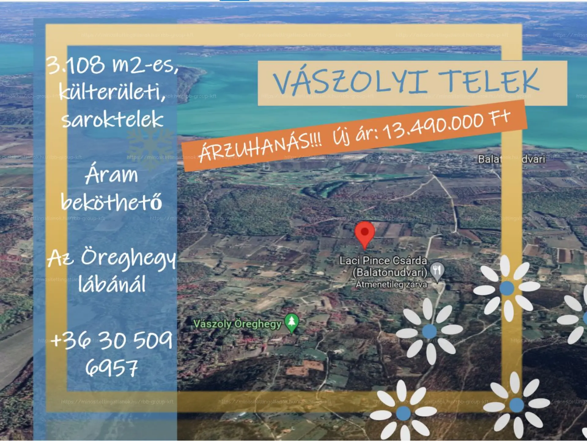 Vászoly és Balatonudvari között, mintegy 2,5 km-re a Balatontól eladóvá vált ez a 3.108 m2-es, teljesen sík, külterületi telek.