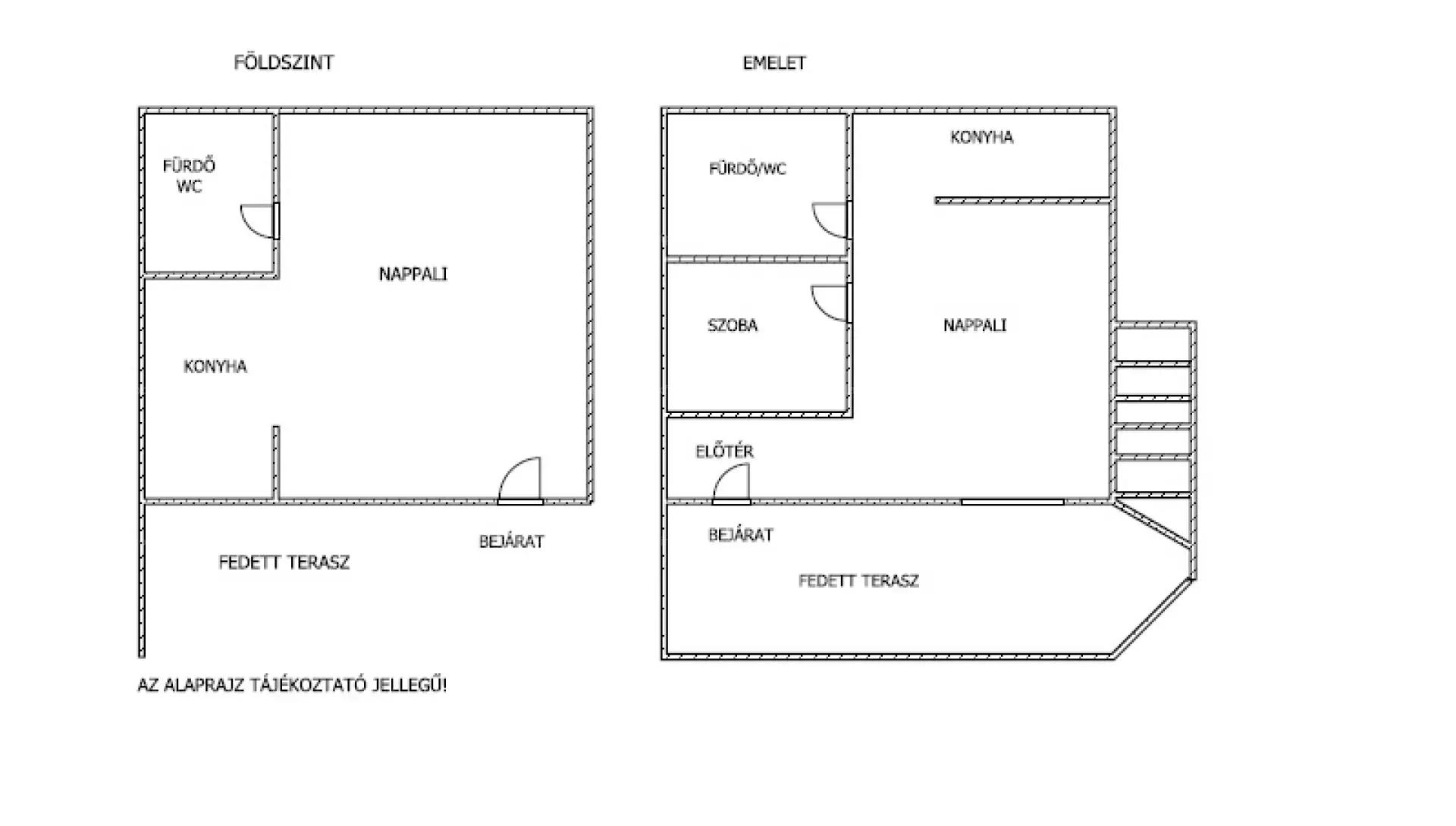 - felső szint: ( fedett terasz 11,5 nm ) – előtér - nappali – konyha – 1 szoba – fürdő/wc.
