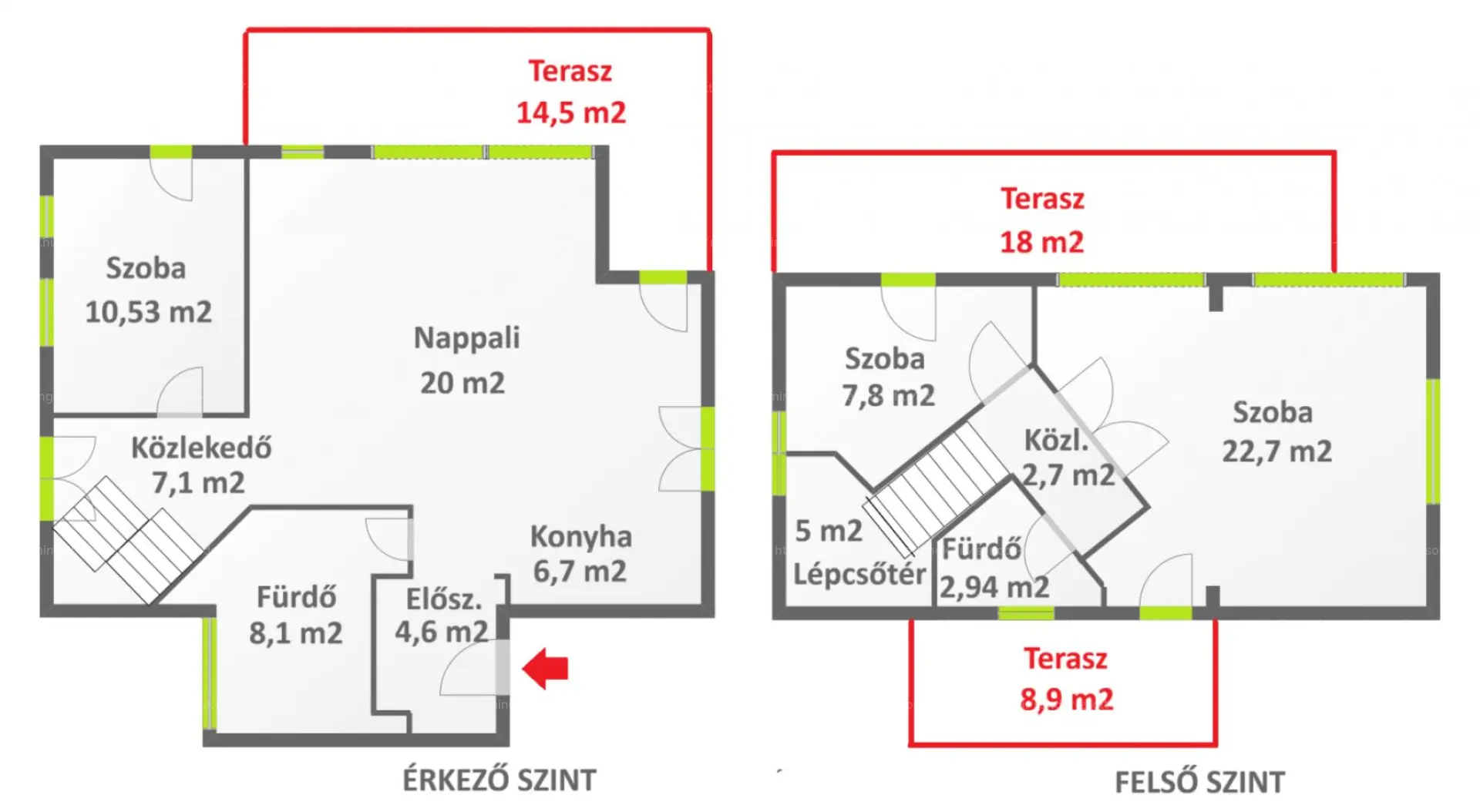 Kialakítását tekintve mindkét szint külön is megközelíthető a lépcsőházon keresztül, így akár két külön lakásként is funkcionálhat.
