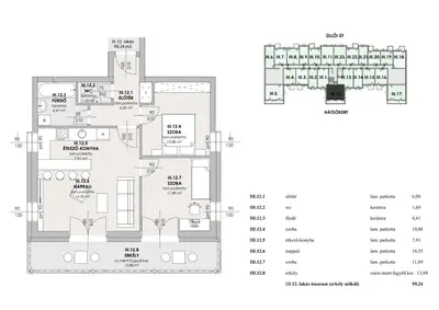 59 m2: előtér, amerikai konyhás nappali, 2 hálószoba, fürdőszoba, külön wc, + 14 m2 erkély