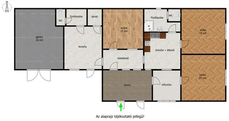 BELSŐ TERÜLETE 104,5 m2 (3 szoba, tágas konyha-étkező, előtér/étkező, közlekedő, fürdőszoba WC-vel) valamint egy fedett, 15 m2-es terasz tartozik hozzá.