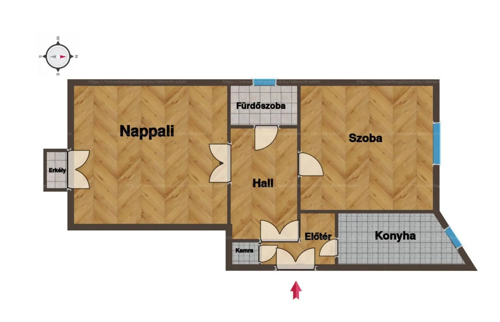 Helyiségek: 2 külön nyíló szoba + hall, konyha, fürdőszoba