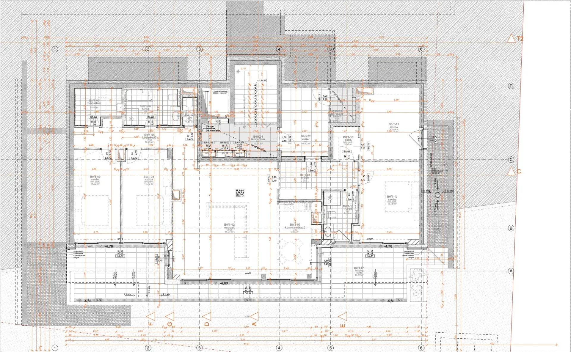 A lakóegyüttes a telek lejtését követve helyezkedik el, az épületek terepszint alatt összeköttetésben állnak, ahol a teremgarázs és tárolók találhatók.