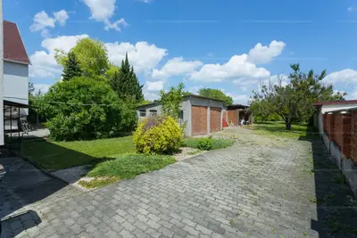 - Elektromos kapu, térkővel burkolt bejáró egészen a garázsig