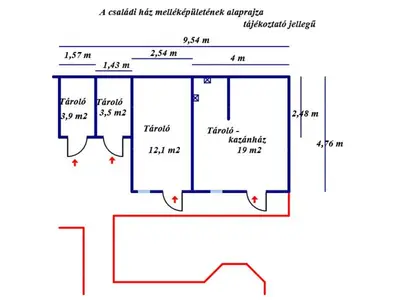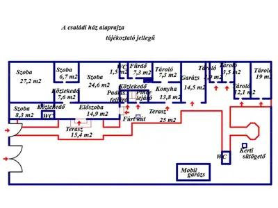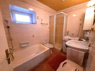 - 4 szoba, tágas konyha, fürdőszoba, 2 WC, 3 közlekedő, előszoba, tároló, pince (22,7 m²)
