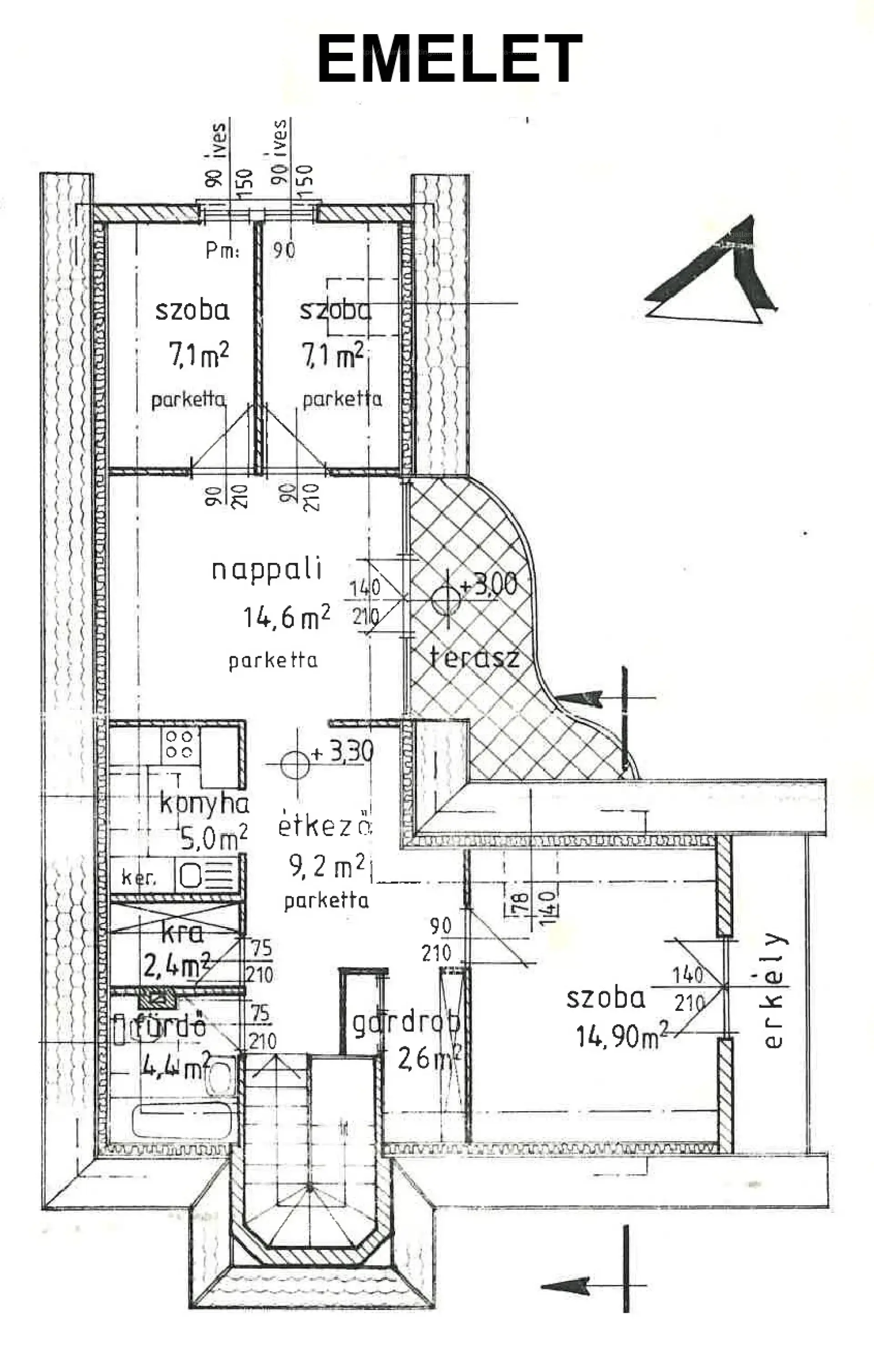 Lakás2: B30-as tégla + szigetelés, Gázcirkó fűtés radiátorokkal, hagyományos faablakok, eredeti burkolatok és szaniterek.