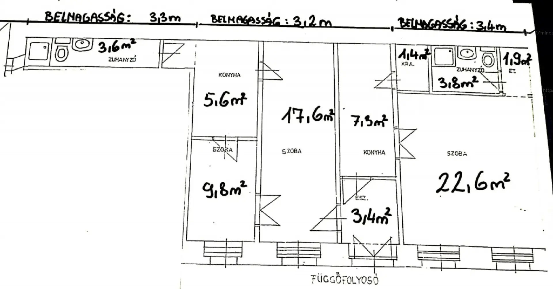 1. lakrész: konyha (7,3 nm), szoba (22,6 nm), fürdőszoba wc-vel (3,8 nm), kamra (1,4 nm).